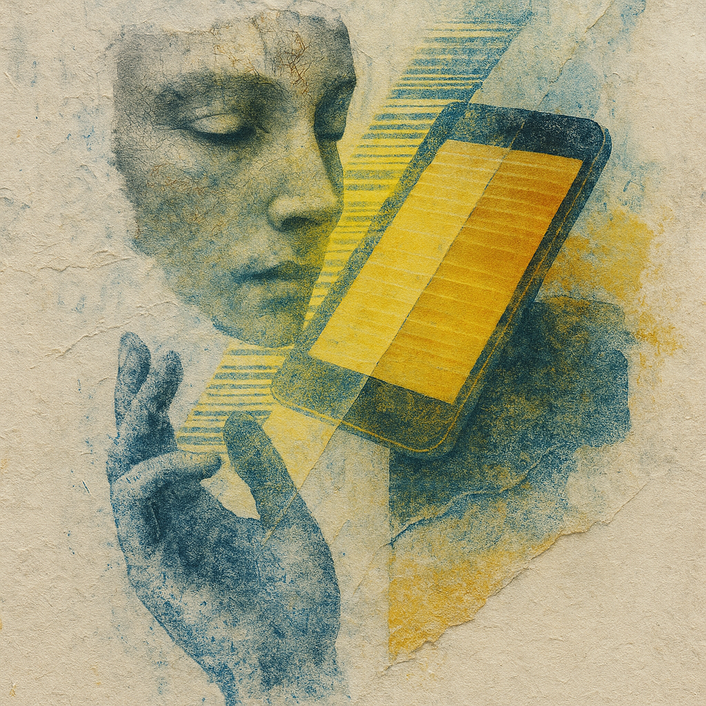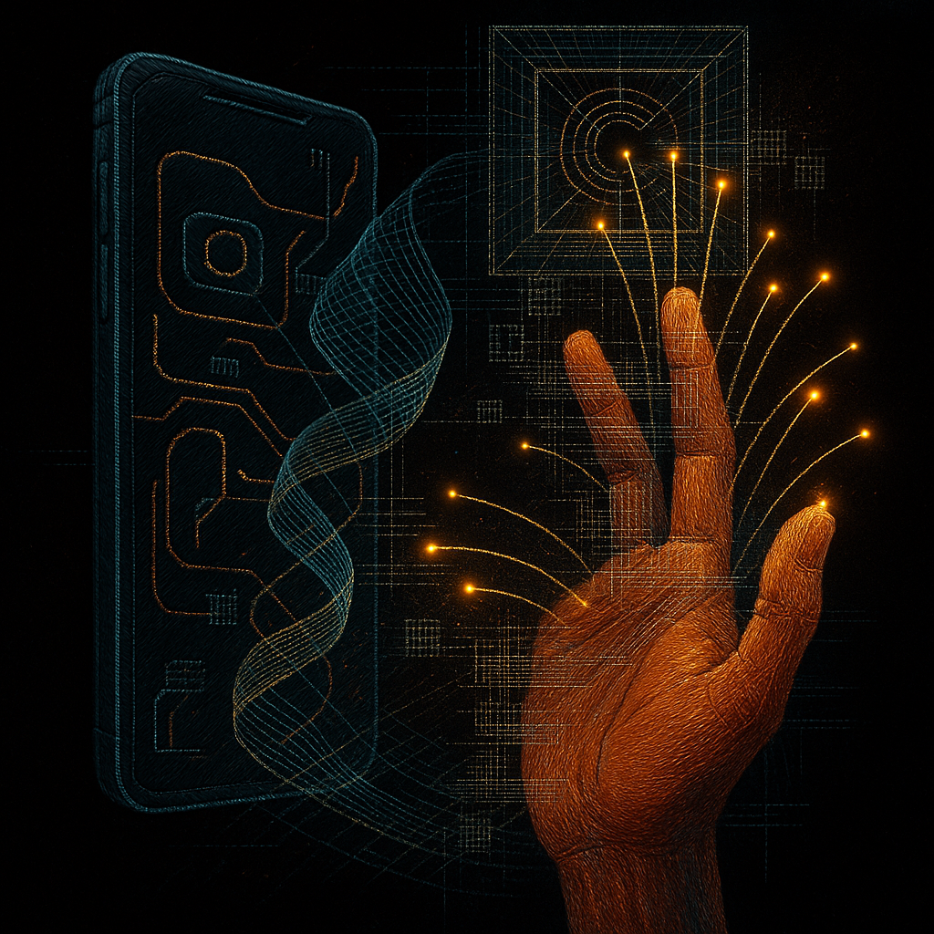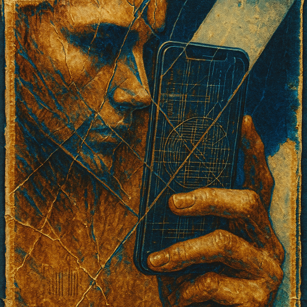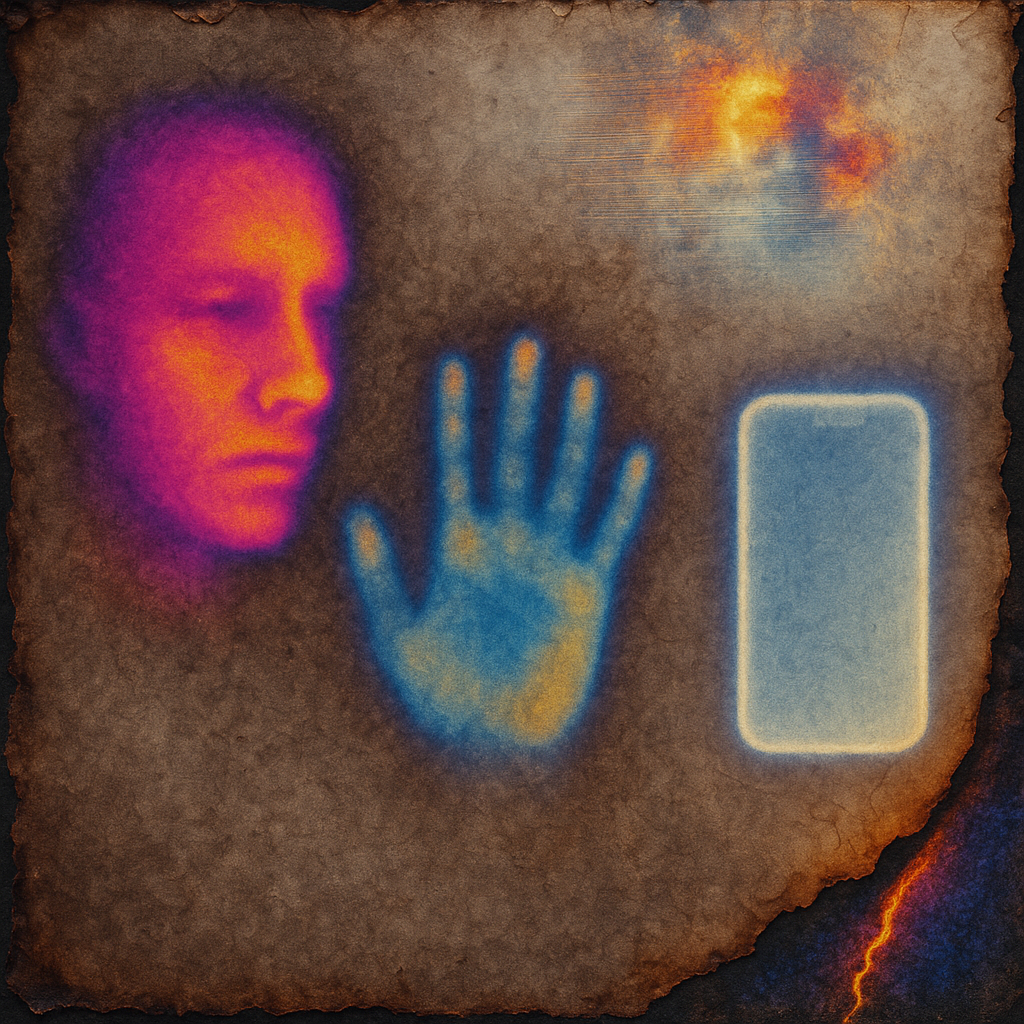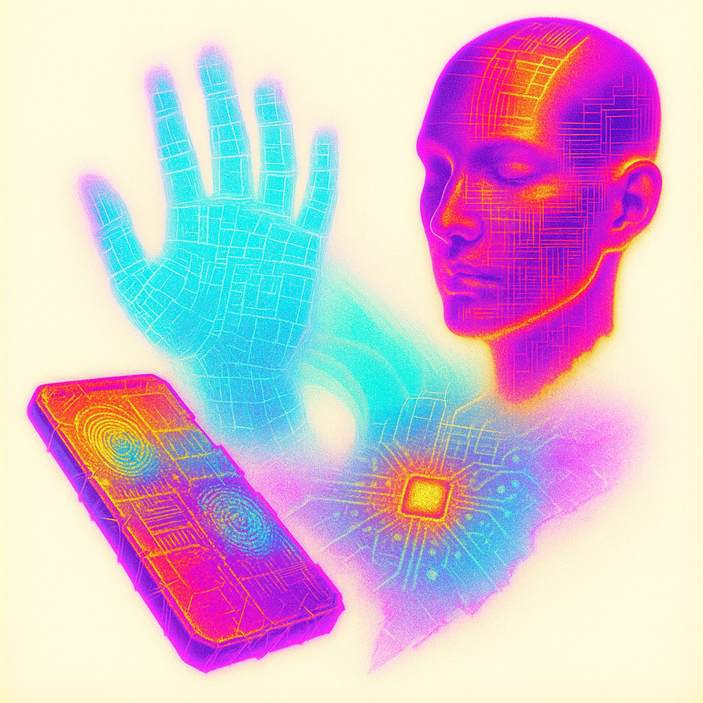 **Your Phone Was Already Your Nerve** I wanted to show the instant we realize the limb and the device were never separate—our reflexes already braided with glass. I split face, hand, and phone into di