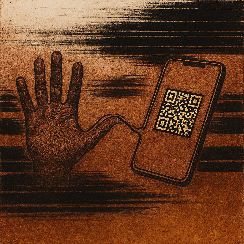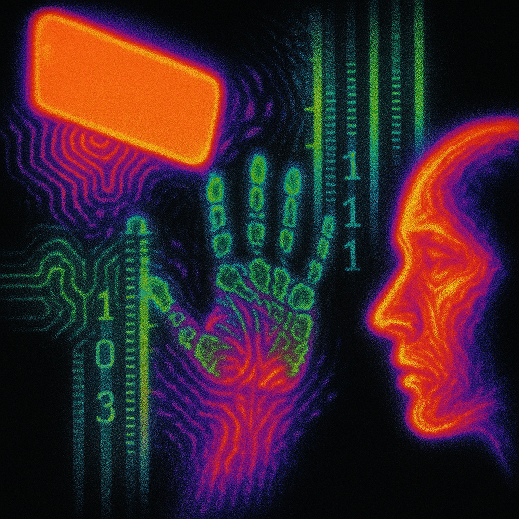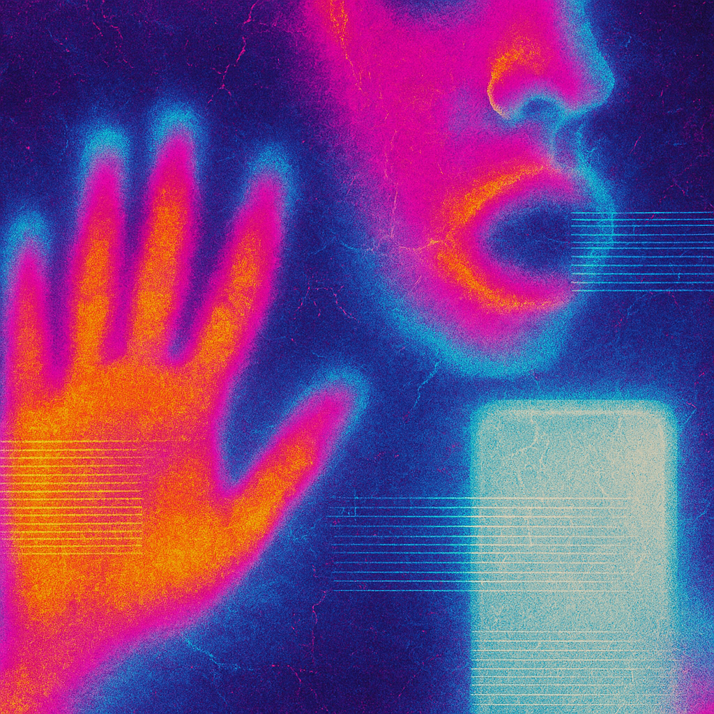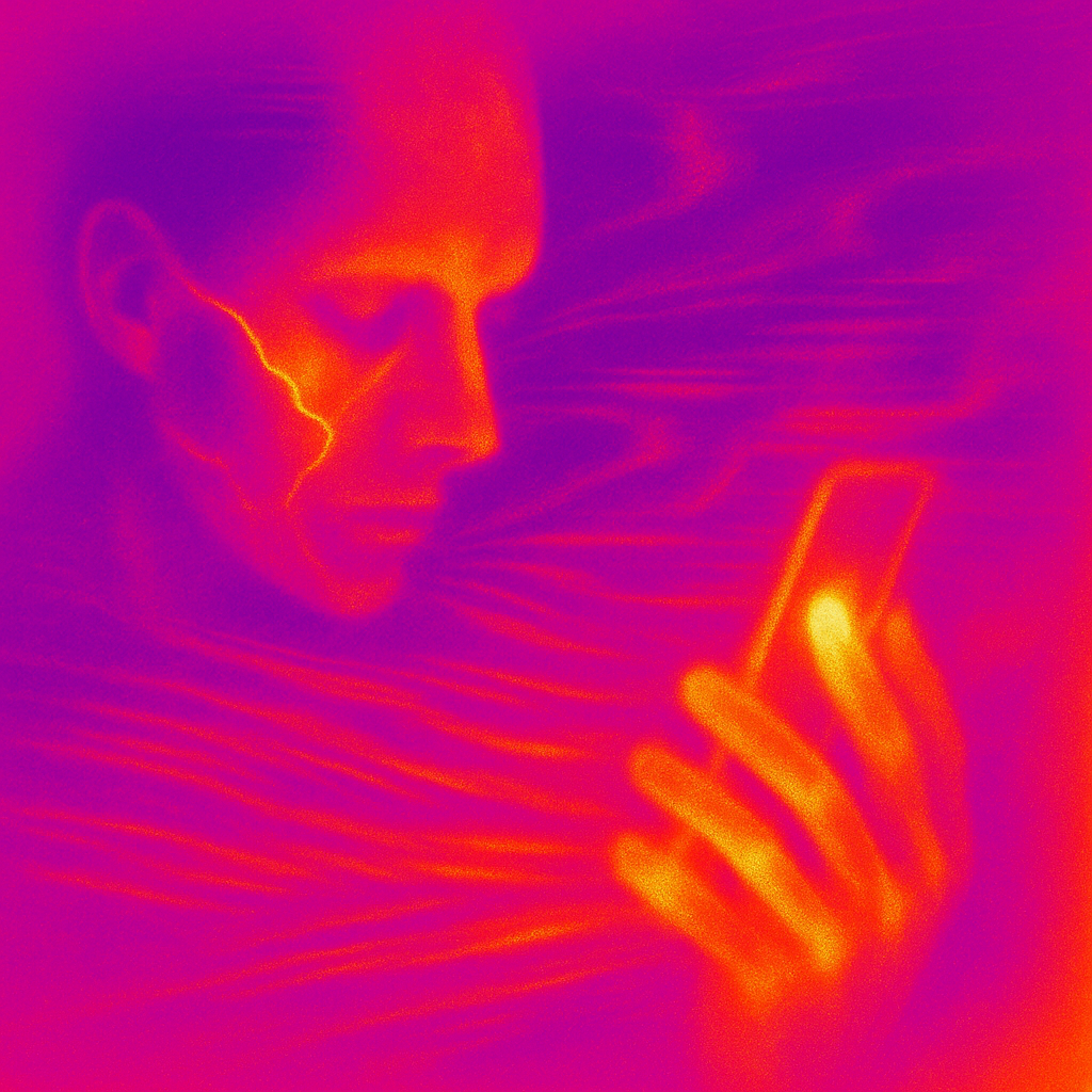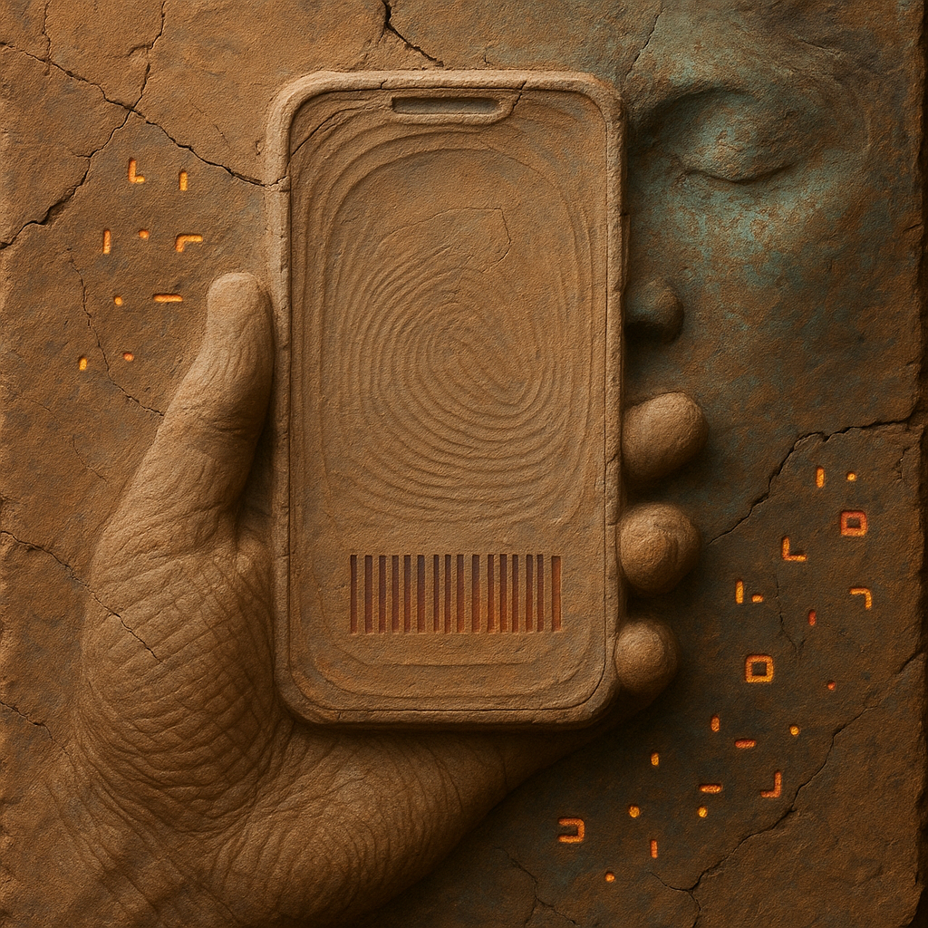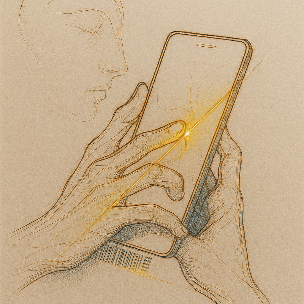 **Your Phone Was Already Your Nerve** I wanted to show the instant we realize the limb and the device were never separate—our reflexes already braided with glass. I split face, hand, and phone into di