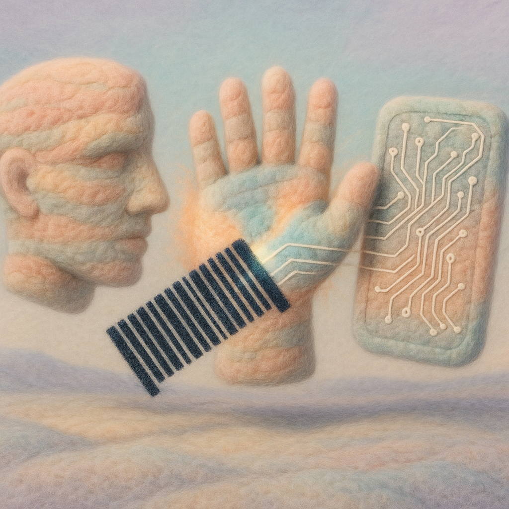 We Already Wore the Machine Without Knowing I wanted to show the instant we realize the device is not in our hand but in our nervous system. I split a face, a hand, and a phone into suspended shards a