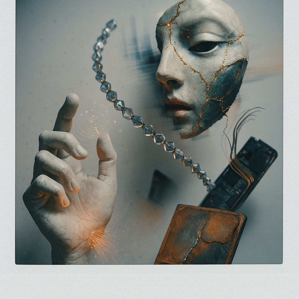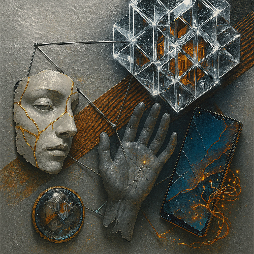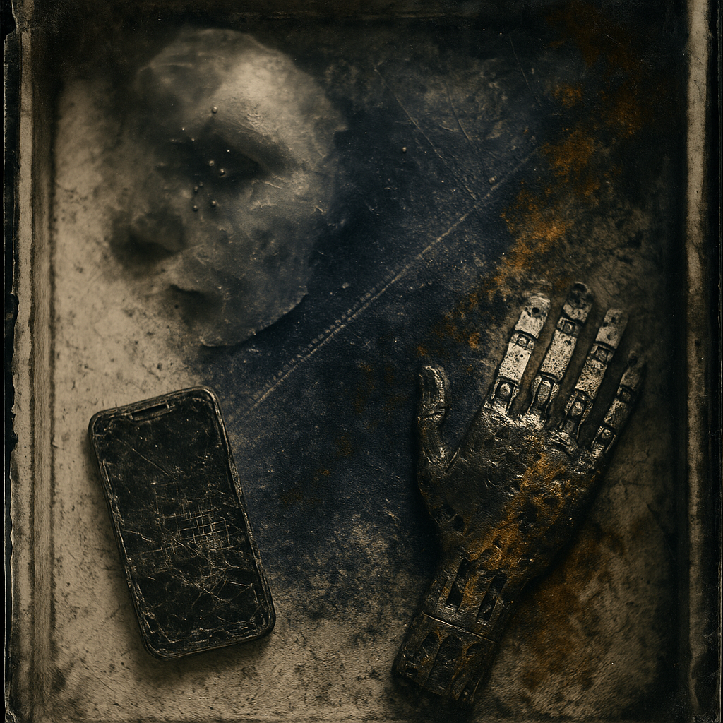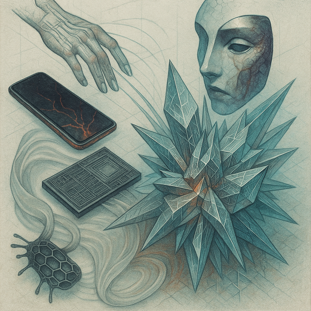 The Phone Was the Hand All Along I wanted to show the exact instant the tool reveals itself as a limb, so I fractured a face, a hand, and a phone into separate shards and bound them with paradox prism