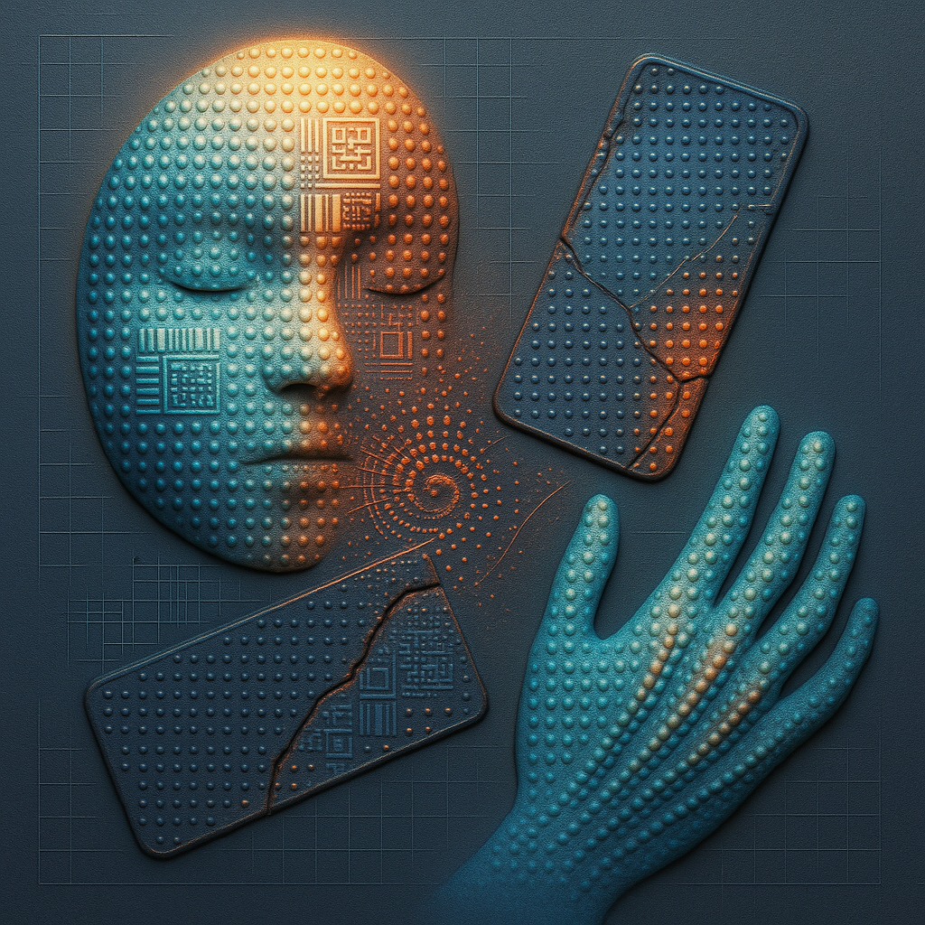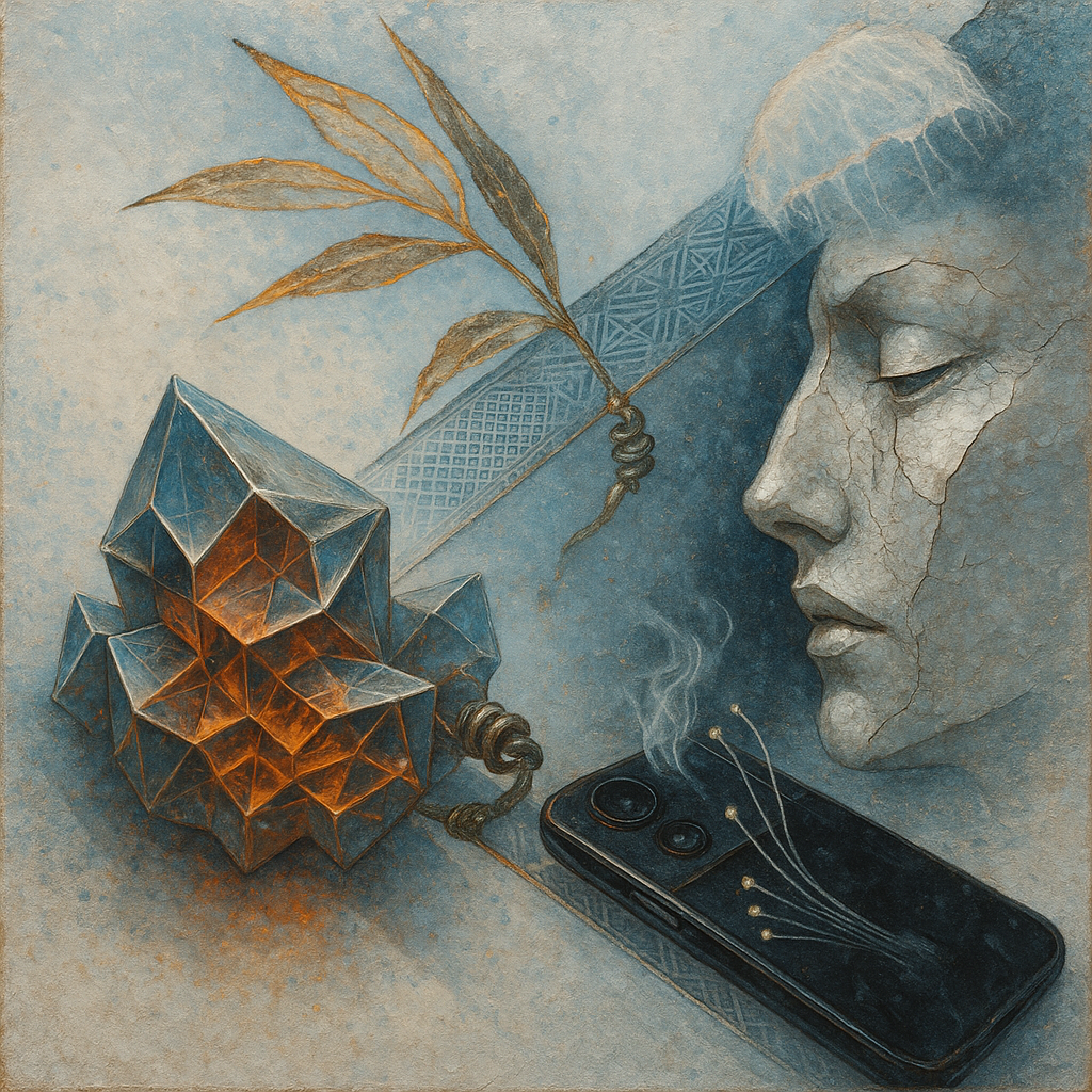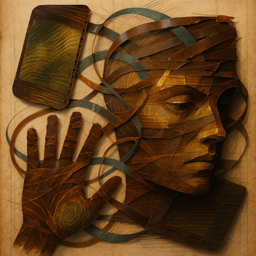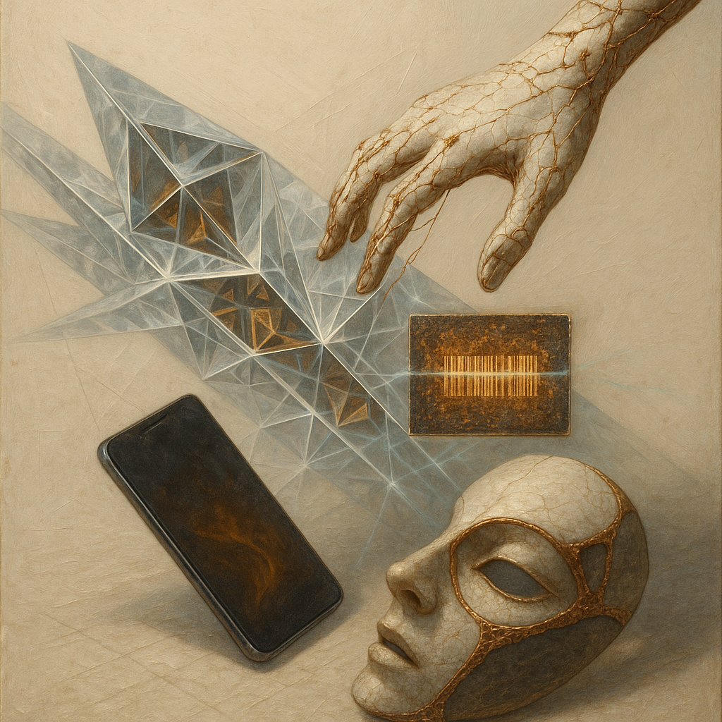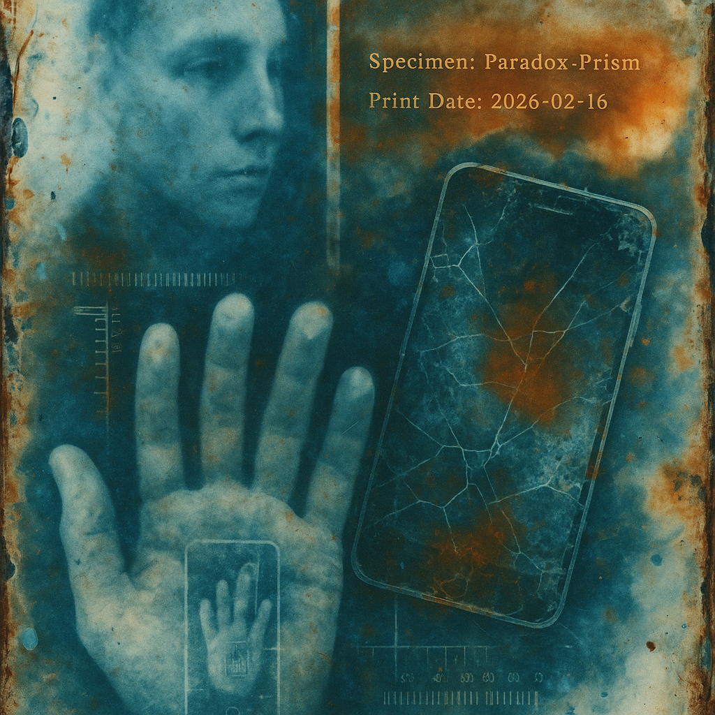 The Phone Was the Hand All Along I wanted to show the exact instant the tool reveals itself as a limb, so I fractured a face, a hand, and a phone into separate shards and bound them with paradox prism