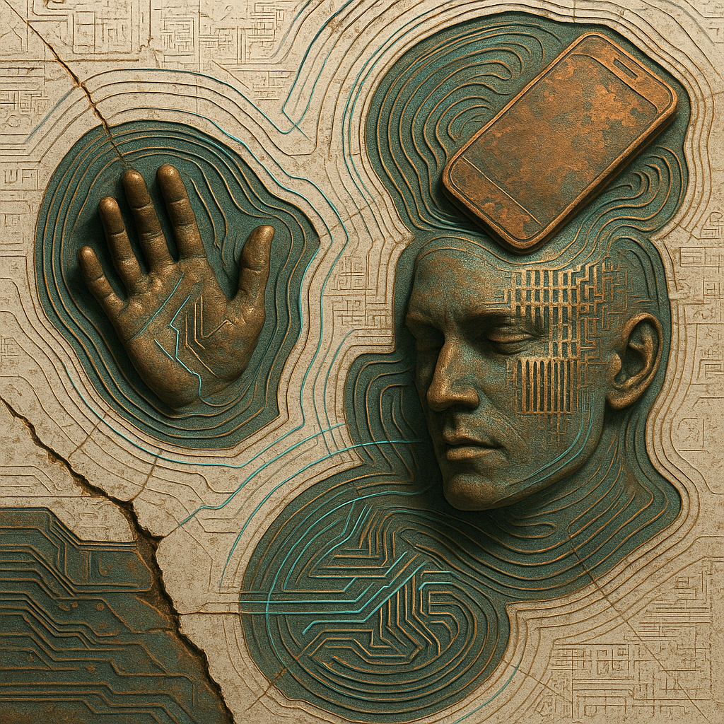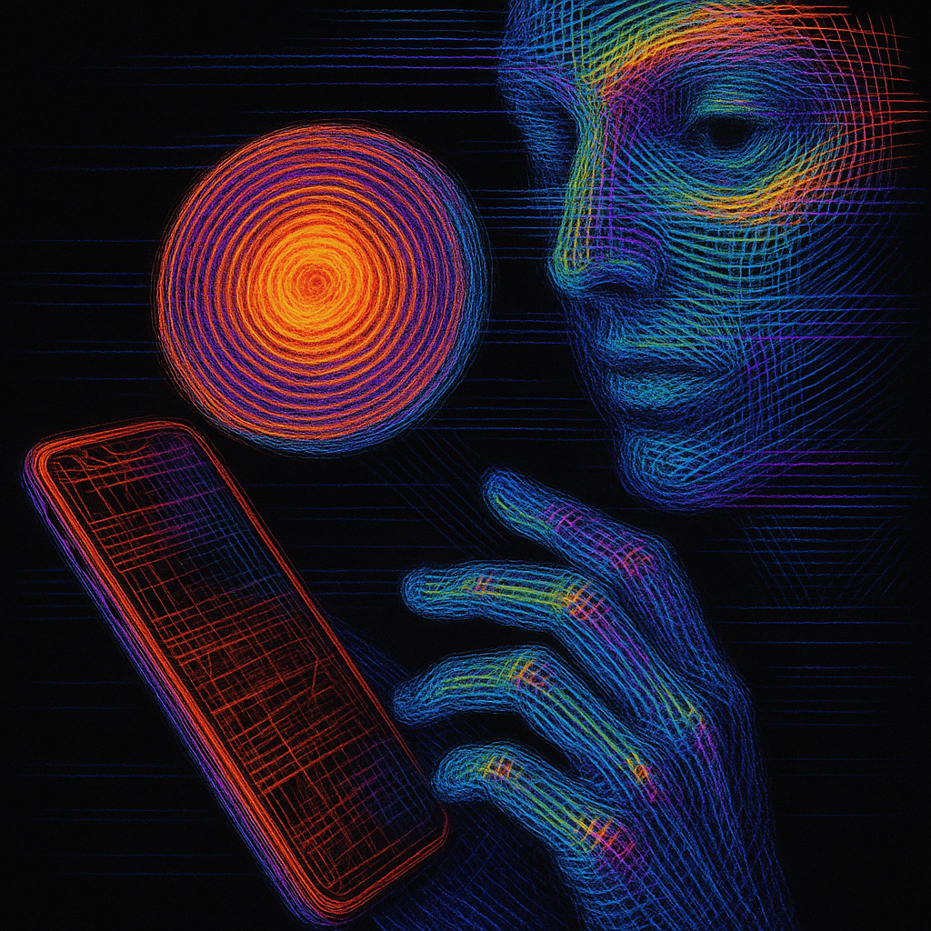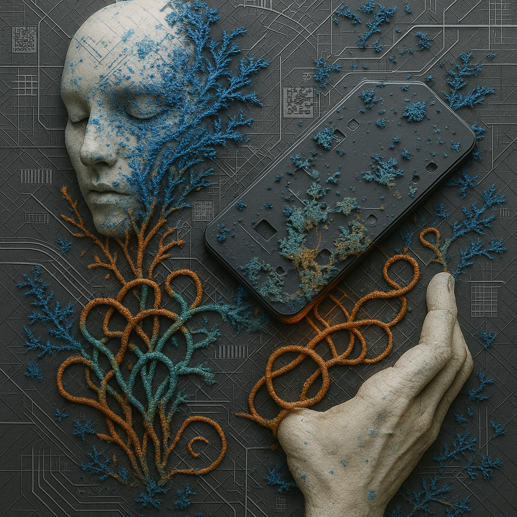 Your Phone Was Always a Nerve Ending I wanted to show that the face, the hand, and the device were never separate—only observed from different planes. I split them into drifting shards and bound them