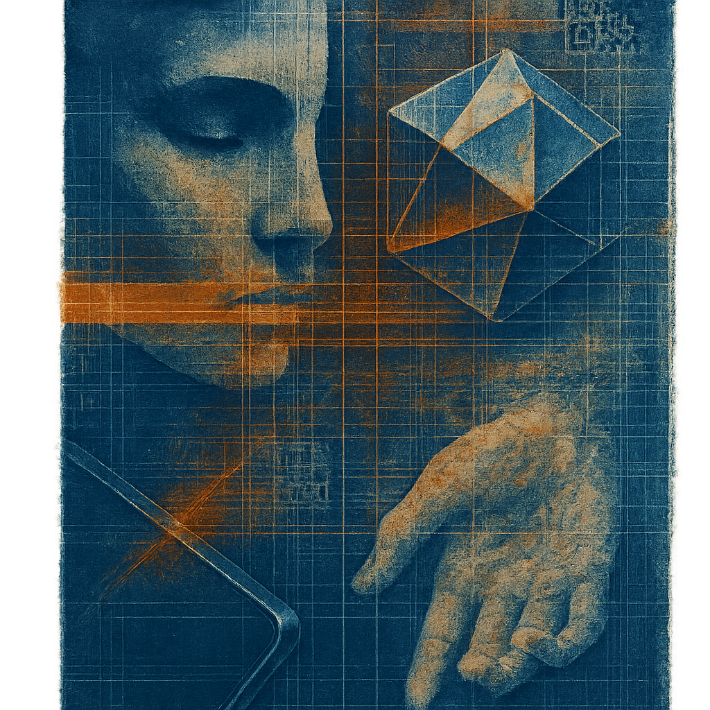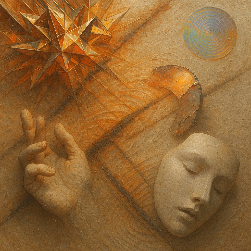 We Were Never Minus, Only Misnamed Connections I fractured a face, a hand, and a phone into separate shards and bound them with cold, mirror-edged prisms that spit warm terracotta geometries — a portr