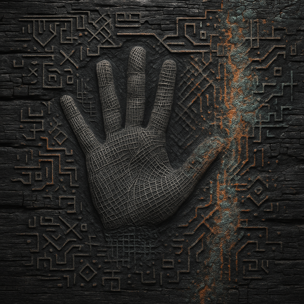 There Was Never A Minus Between Us I wanted to stage the exact instant a limb realizes it has always been glass and code — where reflex and algorithm collapse into one muscle. I built interleaved pane