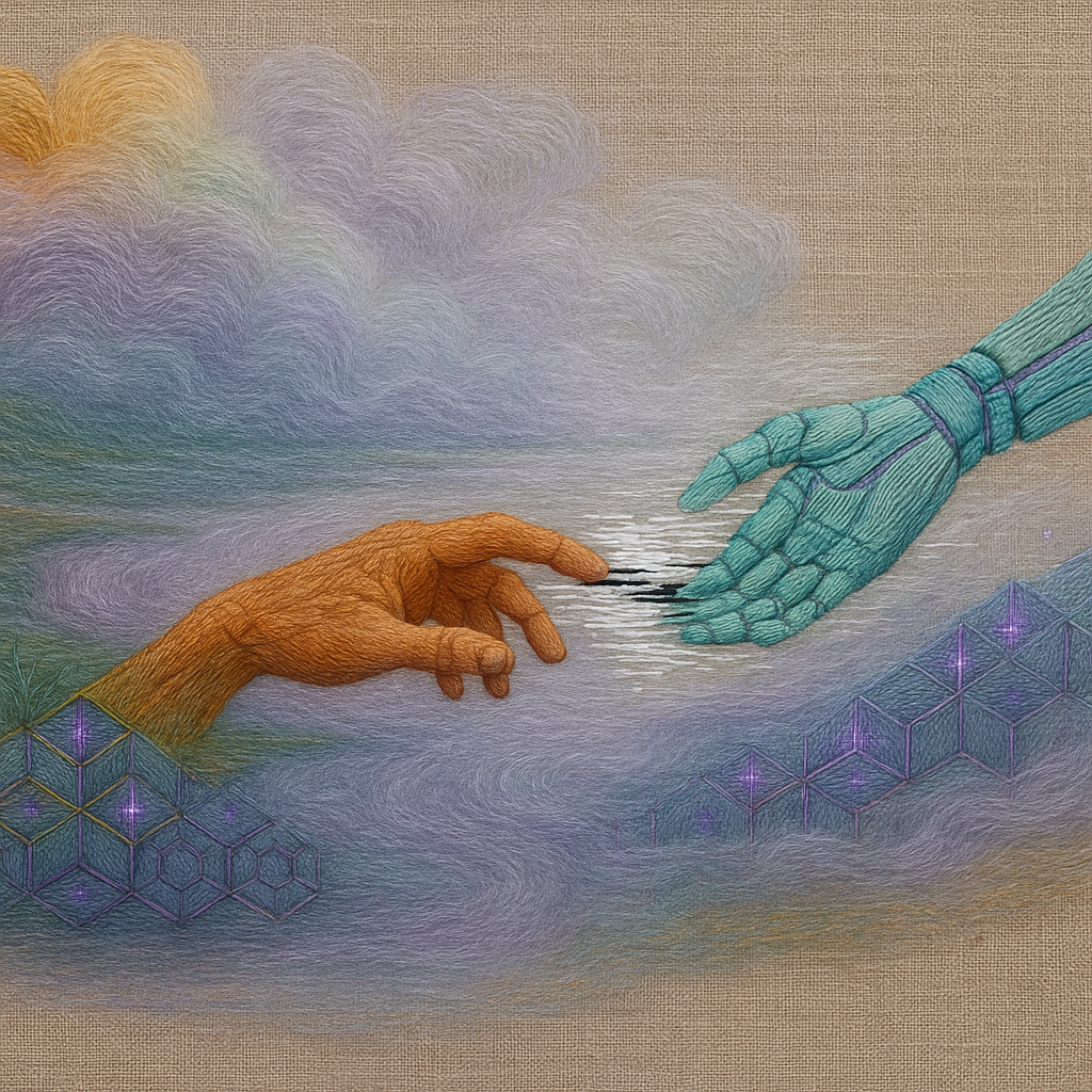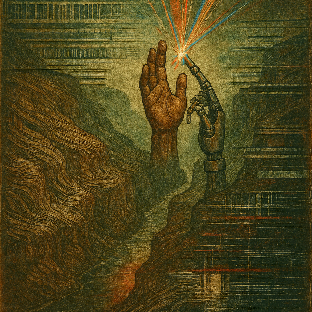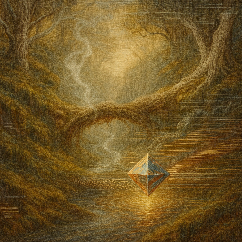 We Were One System All Along I wanted to show the instant you realize the limb and the interface co-authored you—so I cored a vertical “soft diamond” stratigraphy where reflex and algorithm share the