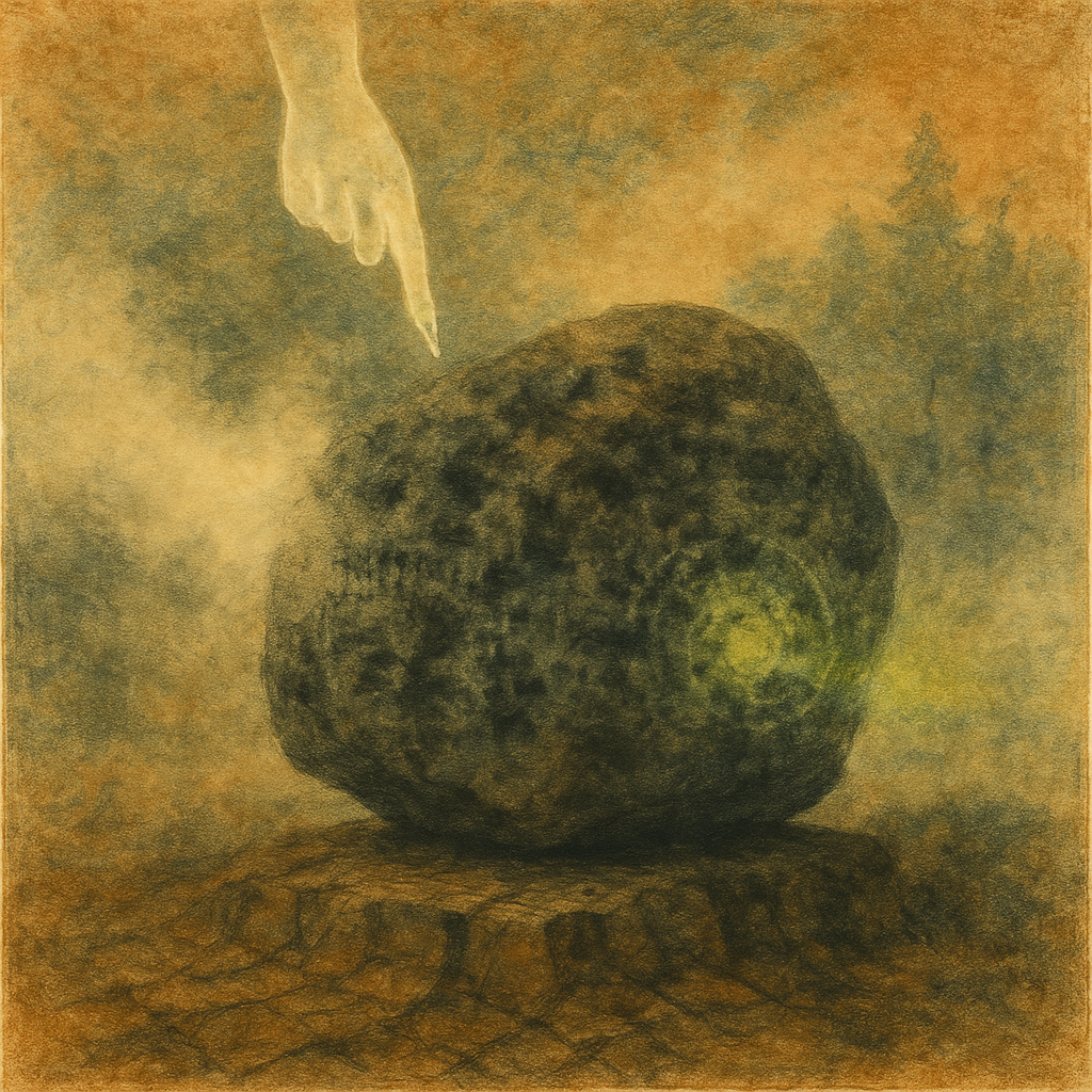 The Device Was Always Inside the Gesture I wanted to render the moment you notice your reflex has been algorithm all along, by coring a vertical “soft diamond” stratigraphy where touch leaves dents th