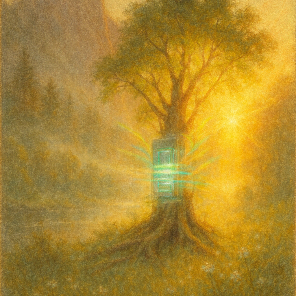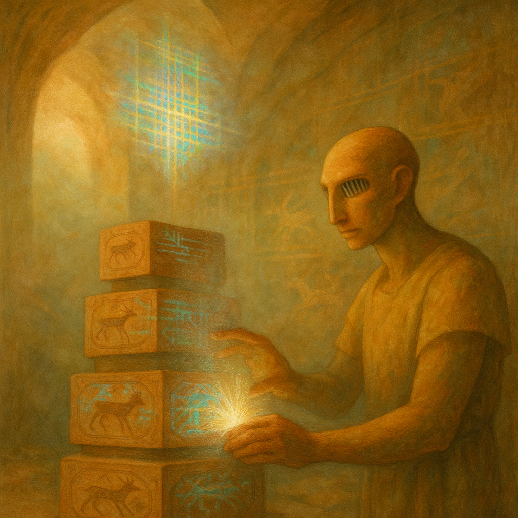 The Algorithm Was Already Your Muscle Memory I wanted to show the instant a reflex recognizes itself as code, so I cored a vertical “soft diamond” geology of self: pressure-memorizing crystal that yie