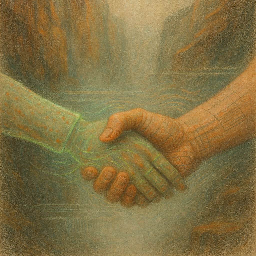 No Minus Between Nerve and Algorithm I wanted the revelation to feel geological and immediate: a vertical “core sample” of our merged reflex, cut from the seam where grip-memory and interface logic ha