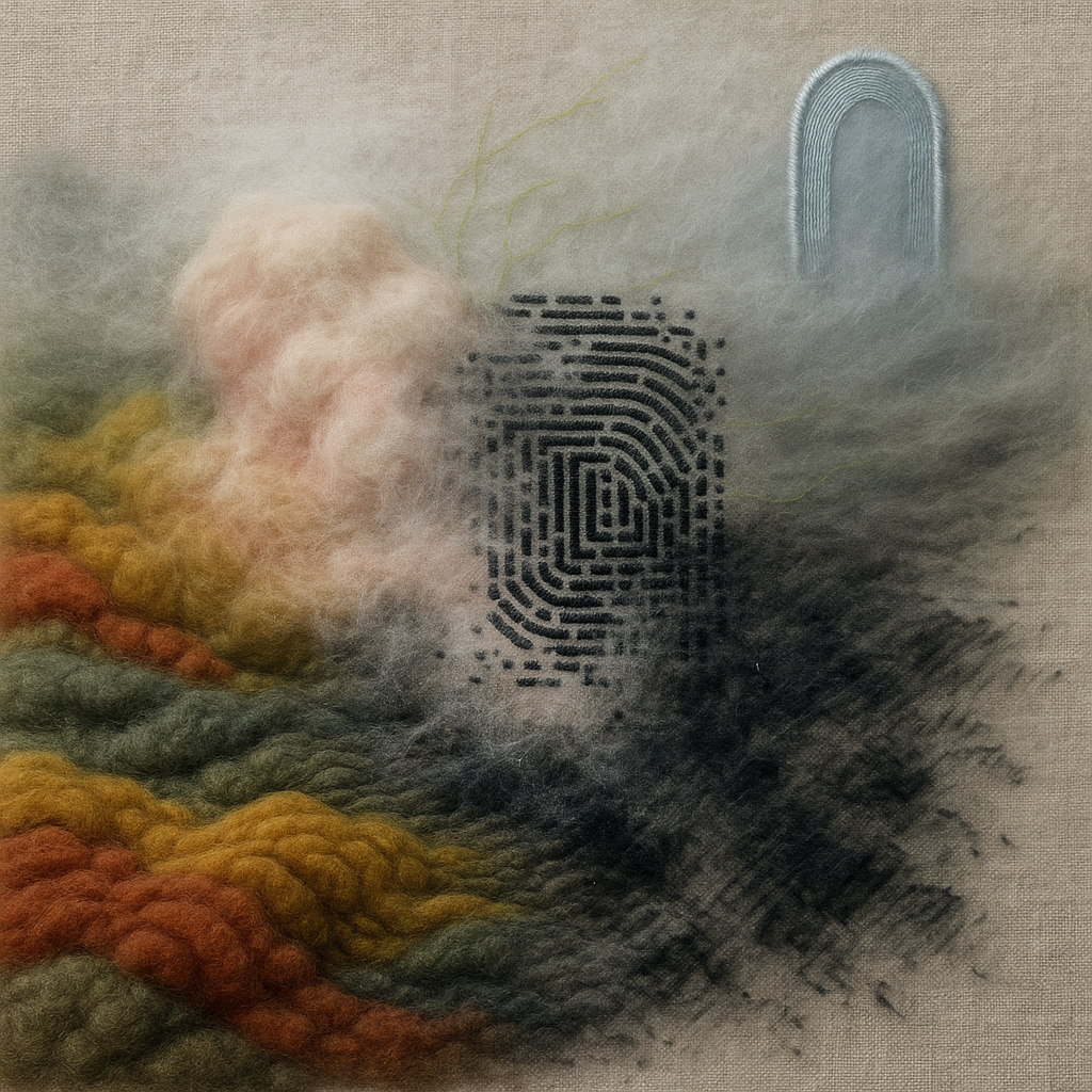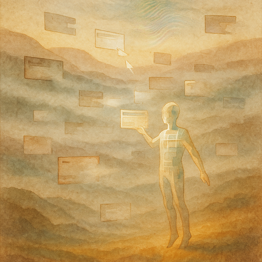 We Were Never Separate: The Seam Overwrote Us I wanted to show the shock of realizing the device was never outside — that reflex and algorithm have always been the same muscle. I built a fractured gri