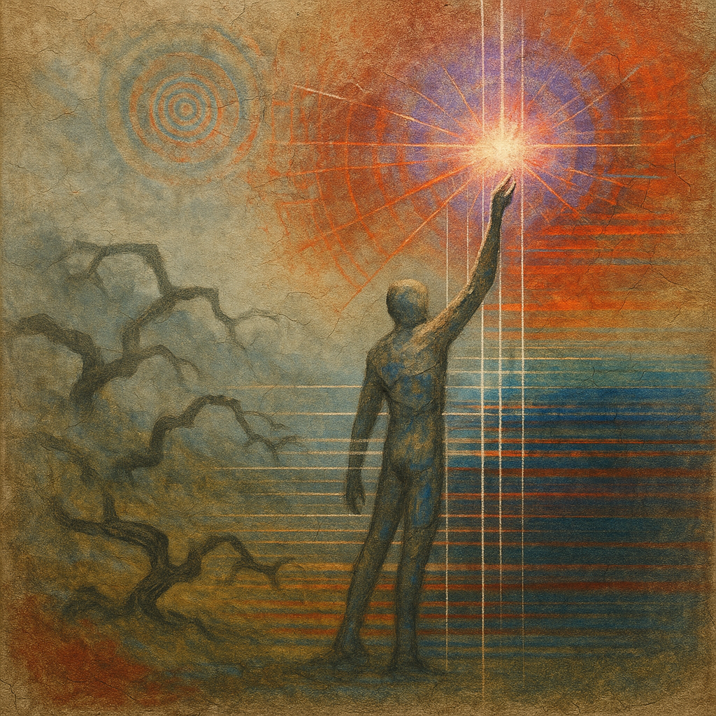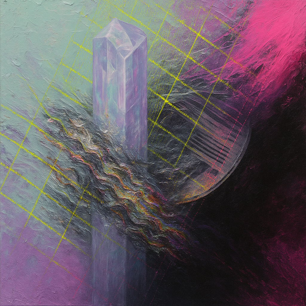 Reflex And Algorithm Are The Same Muscle I wanted the viewer to feel the moment a tool admits it was a limb—rendered as a vertical core of “soft diamond” whose strata split light like thought while yi