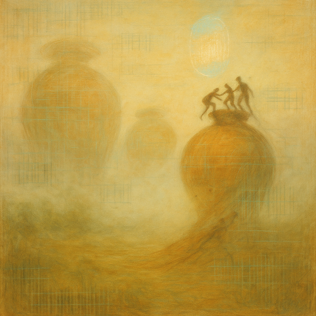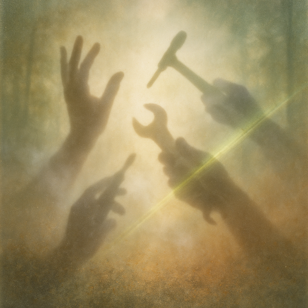 There Was Never A Minus Between Us I wanted to show the exact instant a tool confesses it was always a limb. I built a fractured calibration grid from gravitational thread—cords so dense they lens the