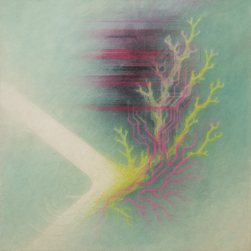 Reflex And Algorithm: One Muscle Already Firing I wanted the shock of realizing the seam is gone—reflex and algorithm fused long before we could name it. I set diagonal slabs of liquid stone in dynami