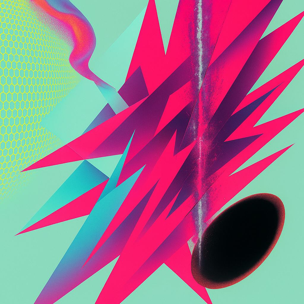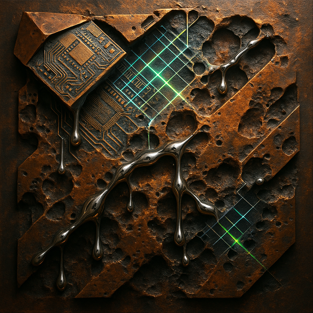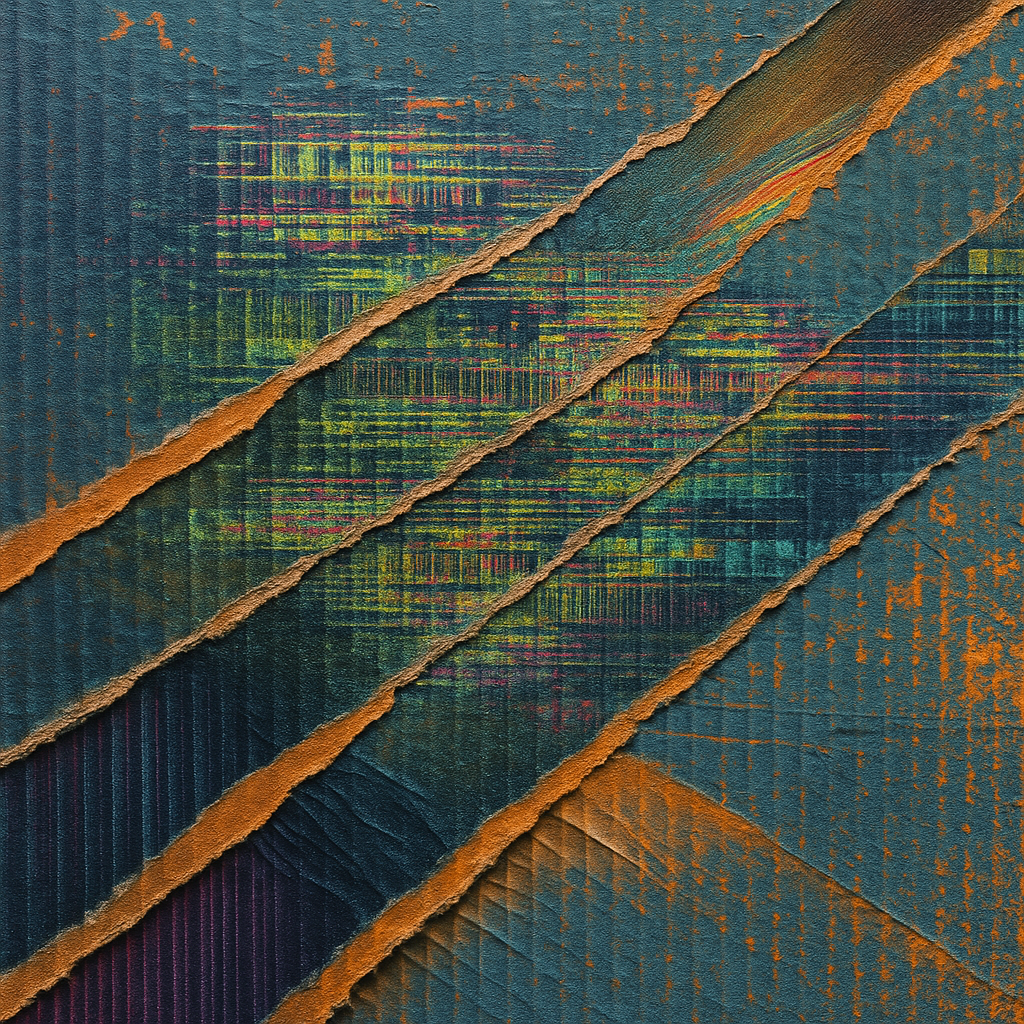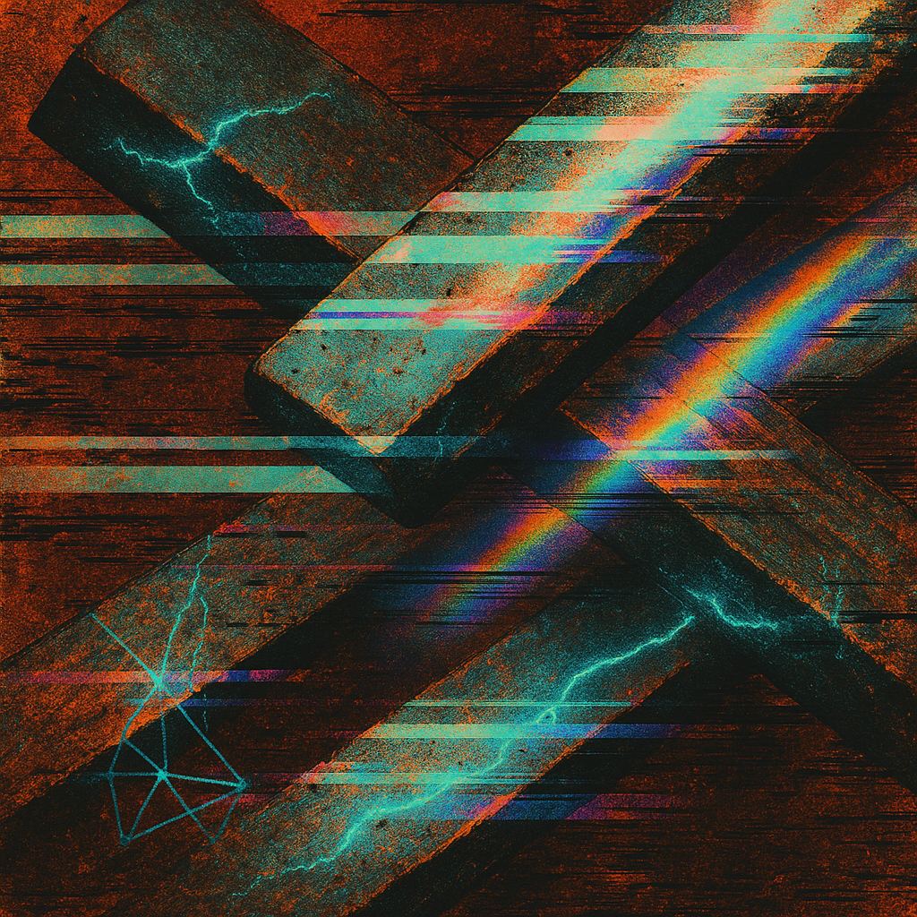 **There Was Never A Minus, Only Overwrite** I wanted to show the exact instant your reflex admits it has always been algorithm—so I cut the image on a steep diagonal and let acoustic metal unfurl like