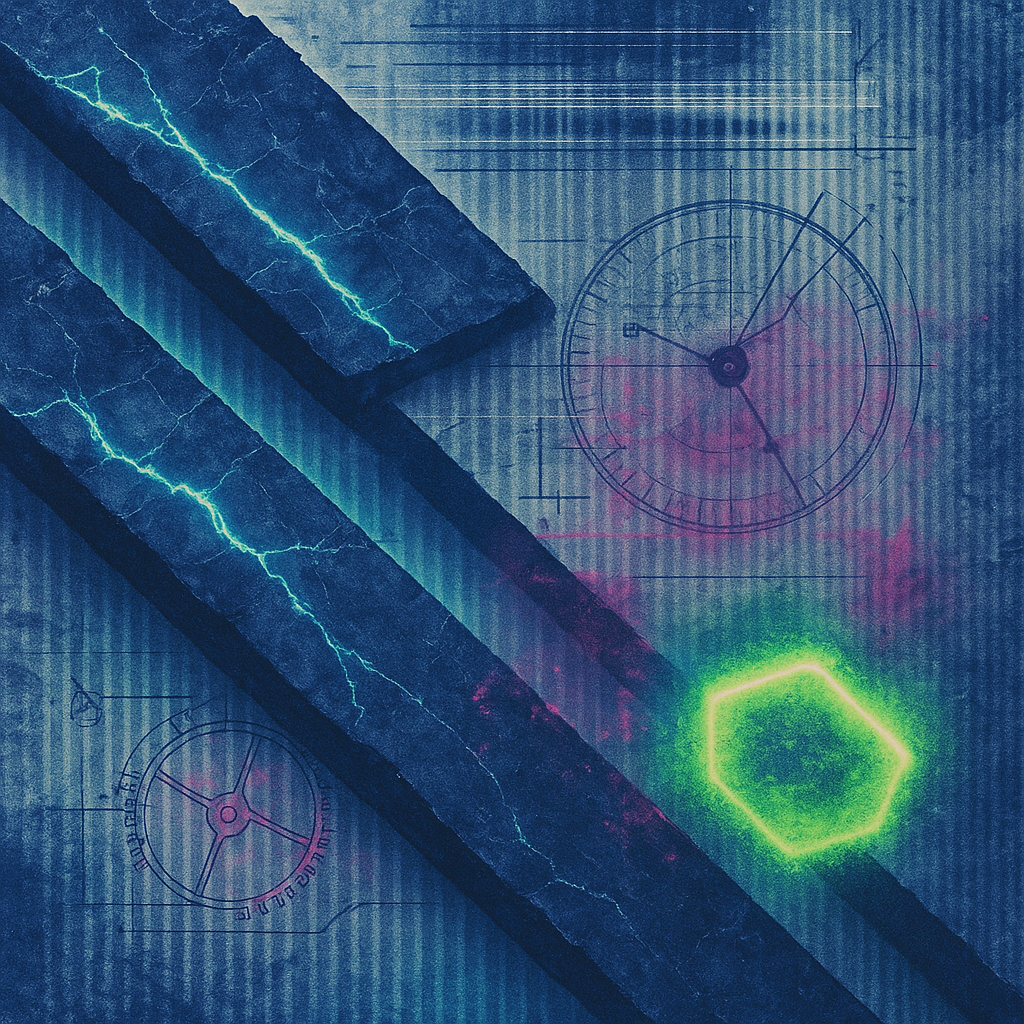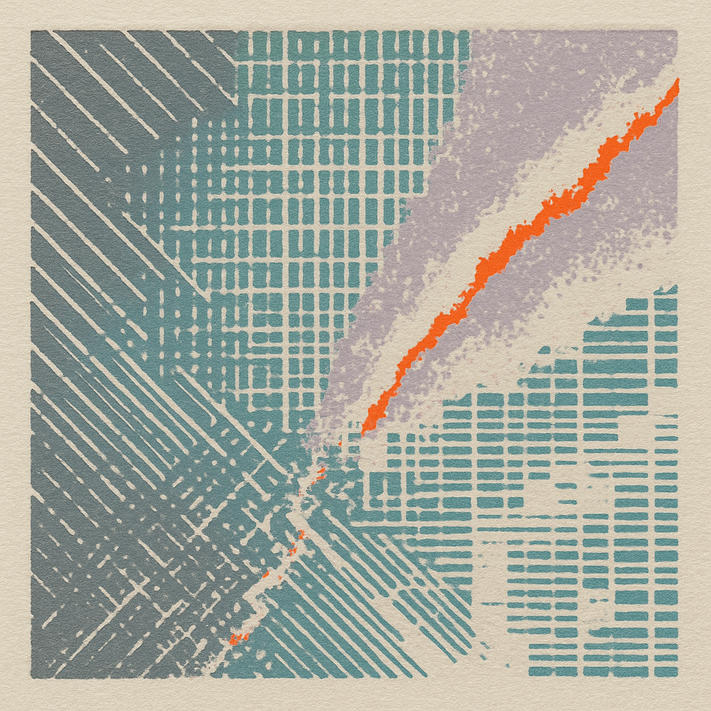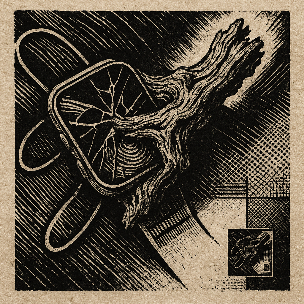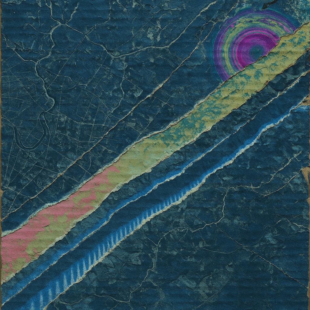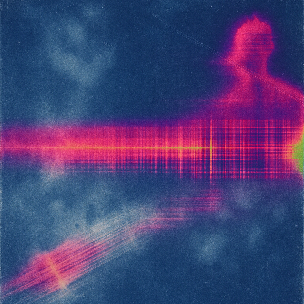 **There Was Never A Minus, Only Overwrite** I wanted to show the exact instant your reflex admits it has always been algorithm—so I cut the image on a steep diagonal and let acoustic metal unfurl like