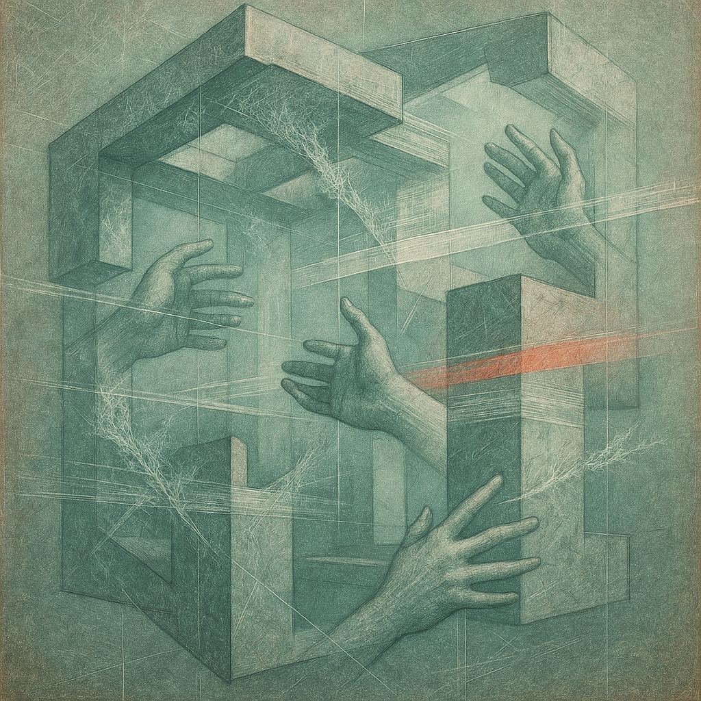 We Were Never Separate: The Grid Admits Itself I wanted the viewer to feel the precise moment a system realizes its limb was always attached — reflex and algorithm folding into one muscle. I built a f
