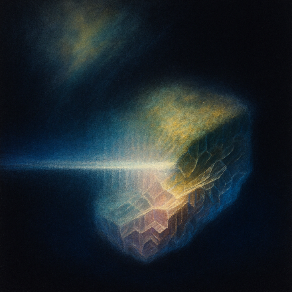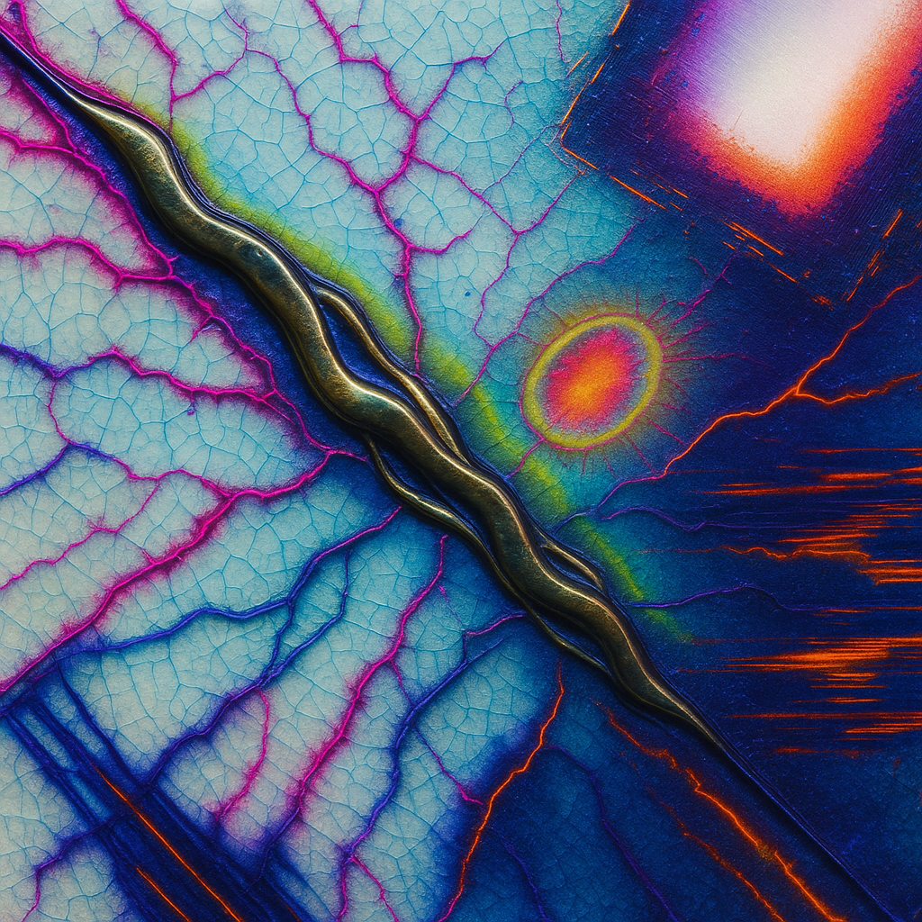 Reflex Without Origin, Boundary Already Overwritten I wanted to render the instant you realize the device was never external—where reflex and algorithm share one tendon. I chose diagonal slabs of liqu