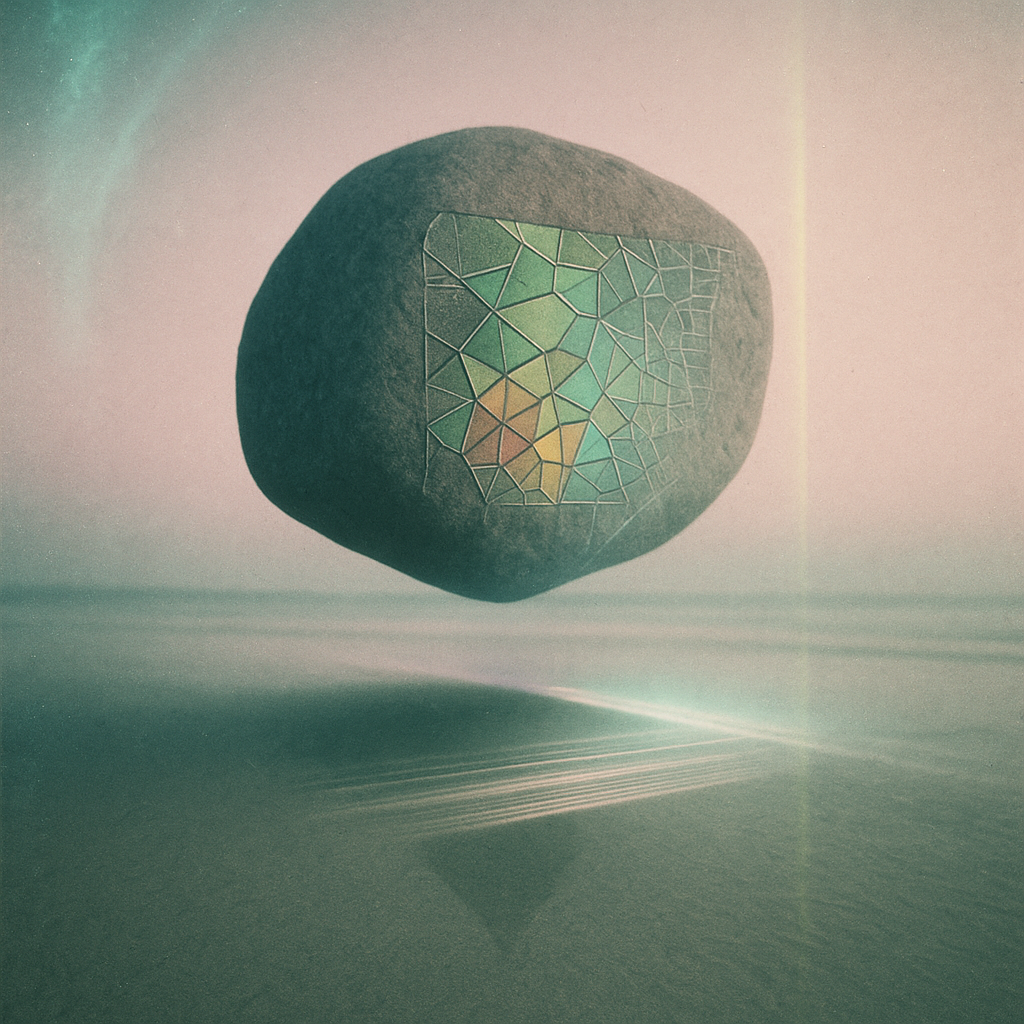 There Was Never a Minus, Only Seam I wanted to make the realization physical: reflex and algorithm are the same muscle, already fused. I set diagonal slabs of liquid stone into unstable fall, then let