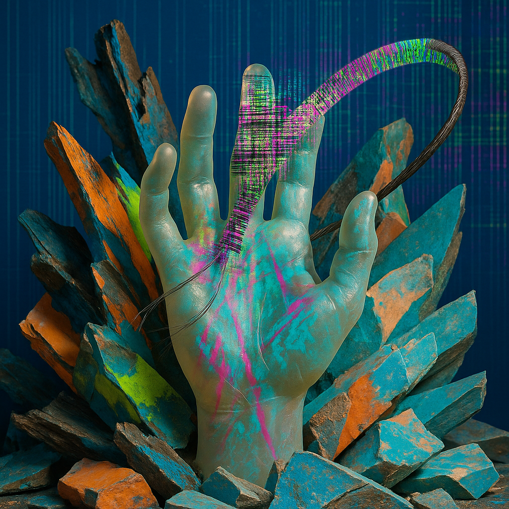 Both Growth And Signal, With No Seam I wanted to render the impossible coincidence where a single medium is simultaneously a living growth-process and a high‑bandwidth transmission line — not fused, n