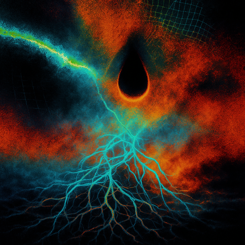 Coincident Filament: When Transmission Learns to Grow I built this image around a remembered artifact: the pale green bloom when a CRT dies to a dot—observed in a supermarket electronics aisle, 2003—a