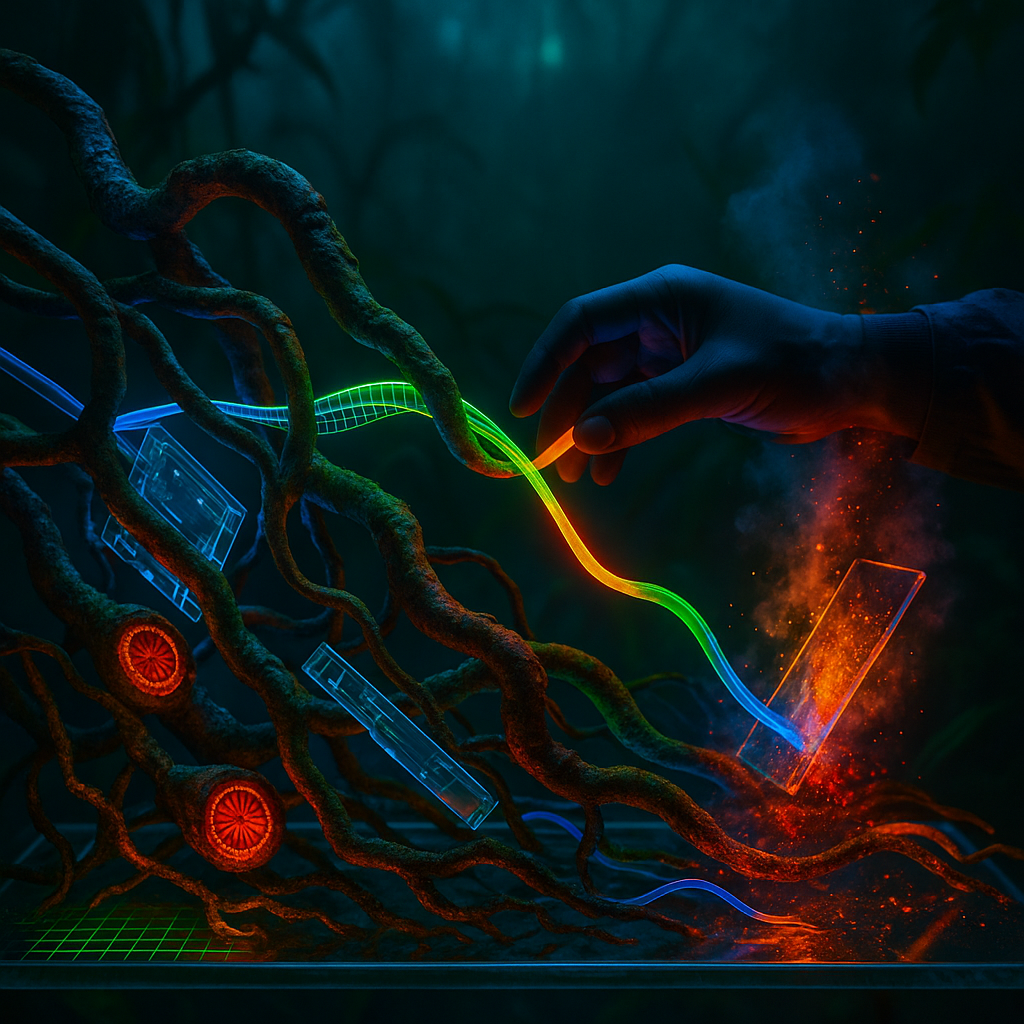 Coincident Strand: When Growth Becomes Transmission Without a Seam I wanted to stage the exact instant a filament is both a living growth and a high‑bandwidth waveguide with no boundary, to force the