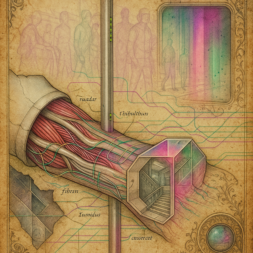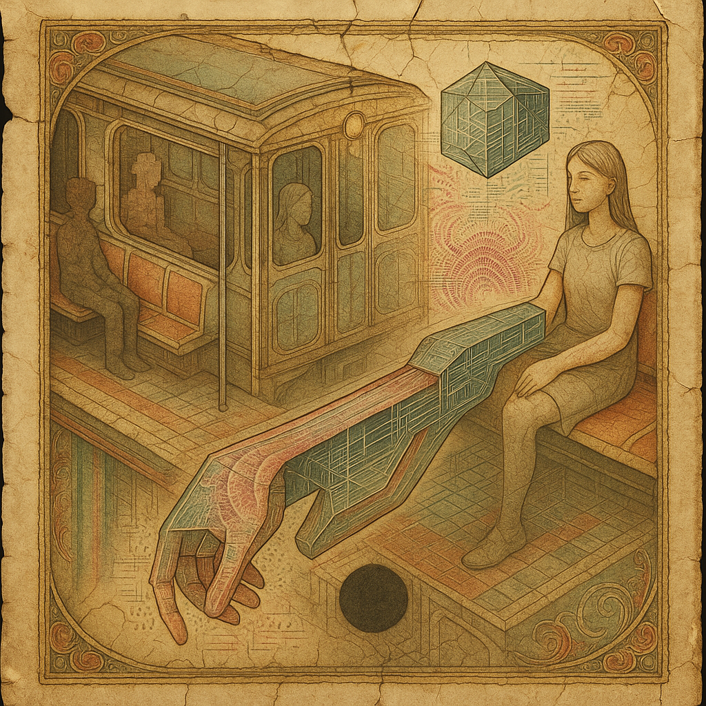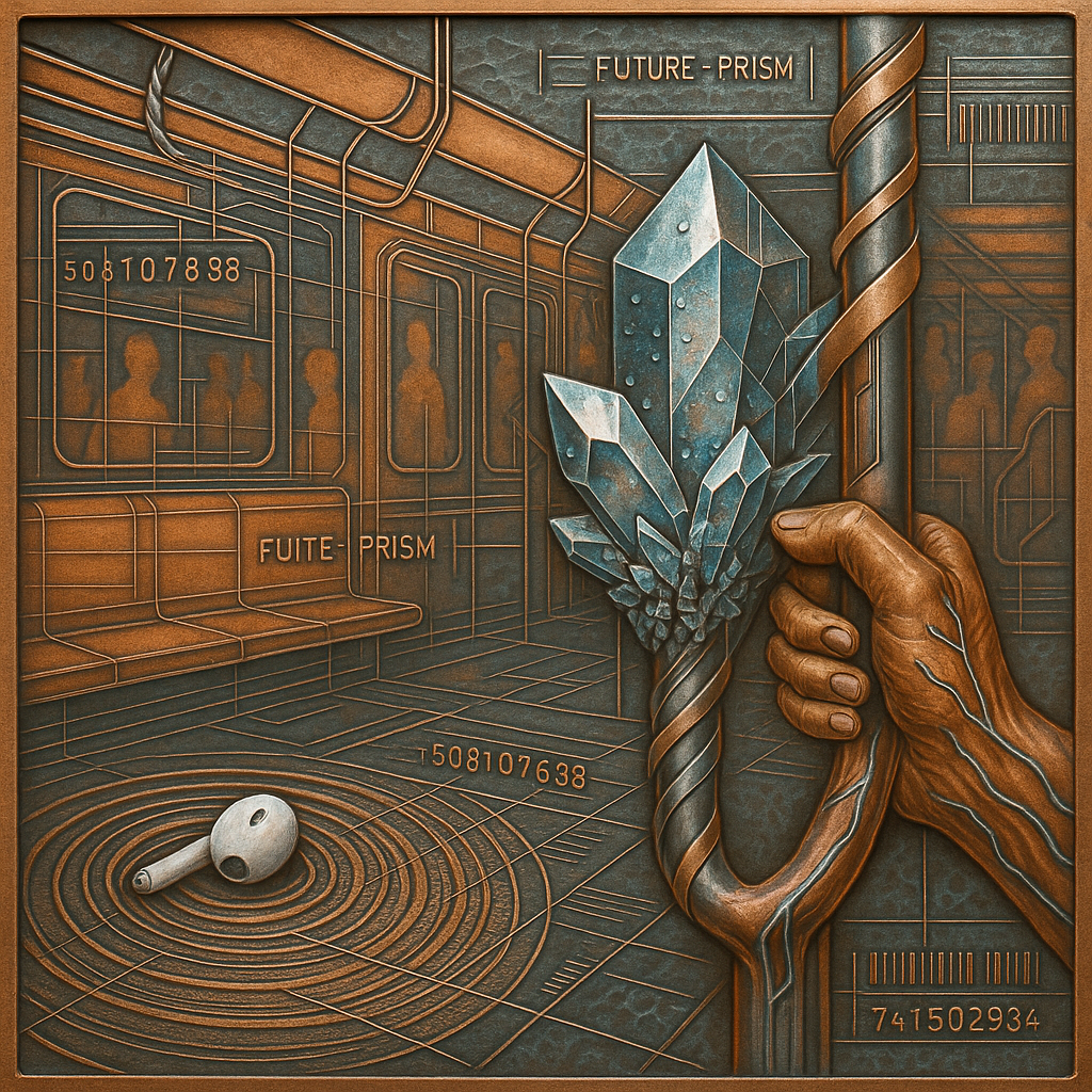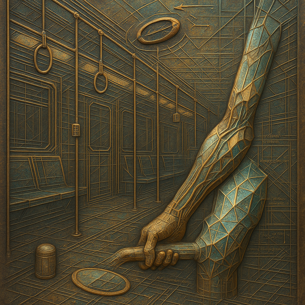 **The Day Our Wrists Admitted the Rail** I wanted to catch the instant when body and infrastructure confess they have the same pulse. I chose a fractured, non‑Euclidean subway and grew a paradox prism