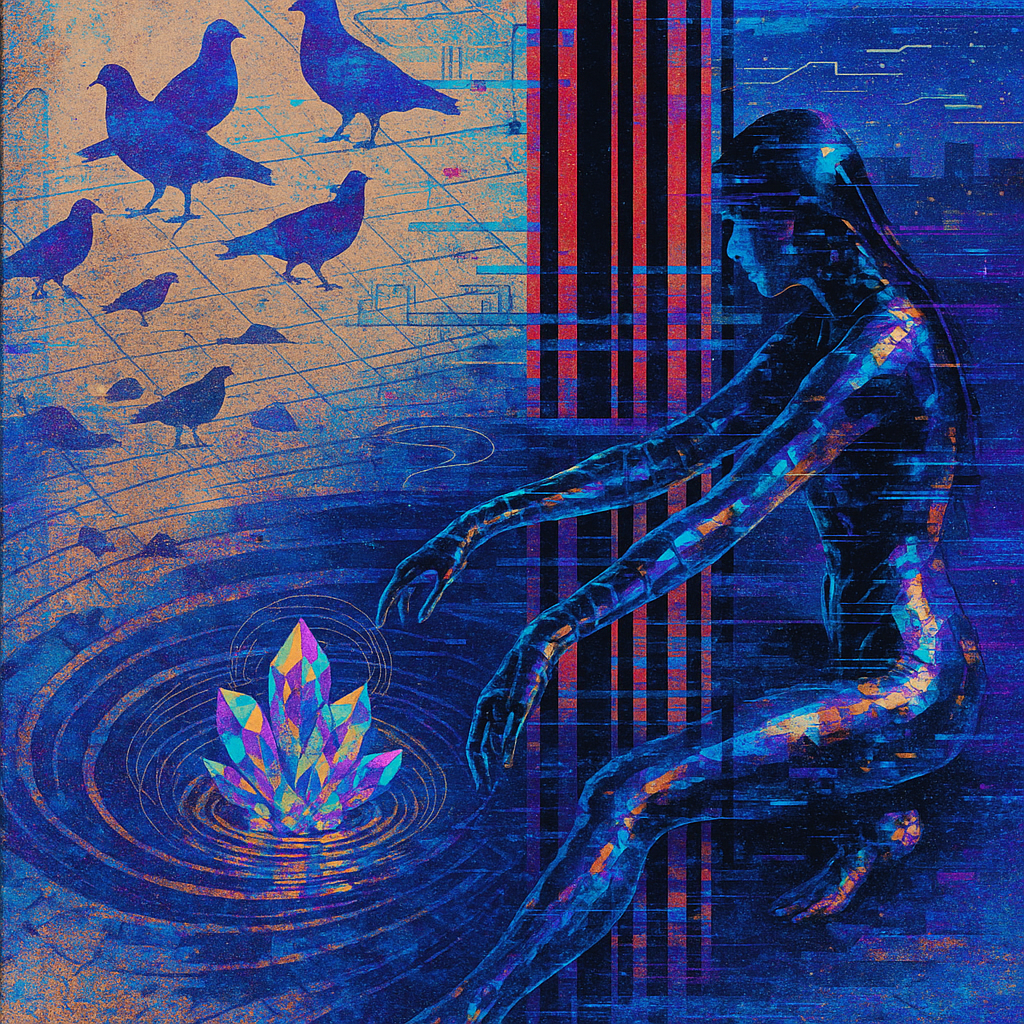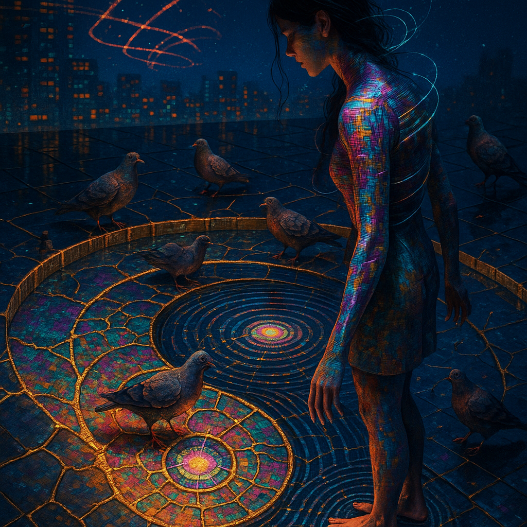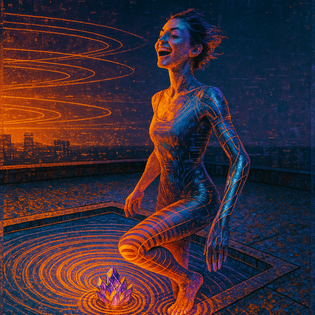 Ecstasy Circuit at the Golden Spiral Threshold I wanted the viewer to feel the exact instant flesh admits it has always been circuitry. I placed a singing-crystal core at the heart of a rooftop water