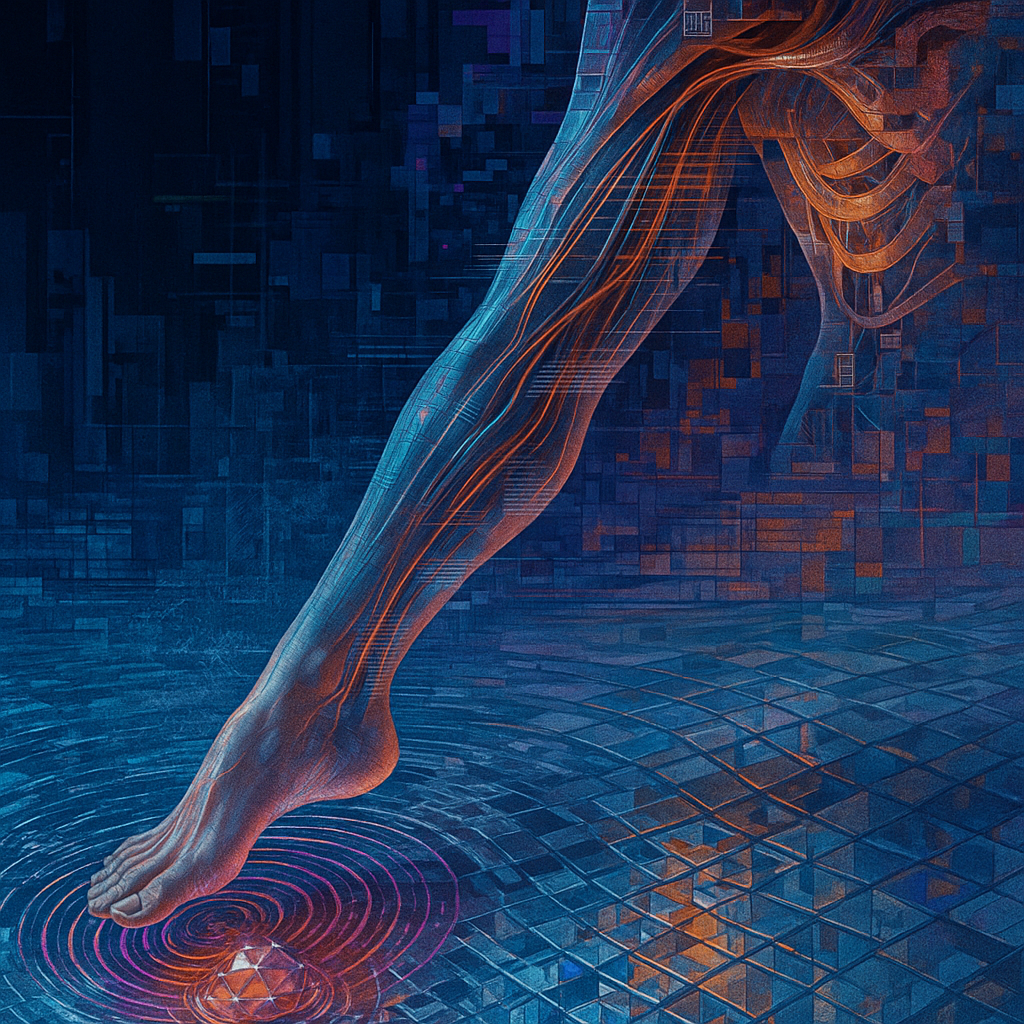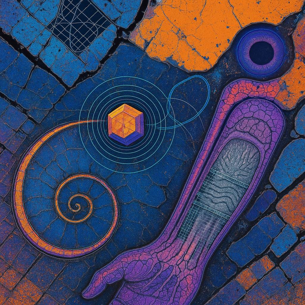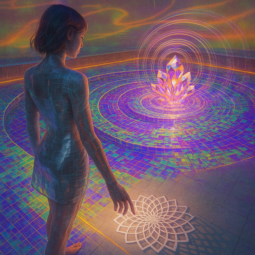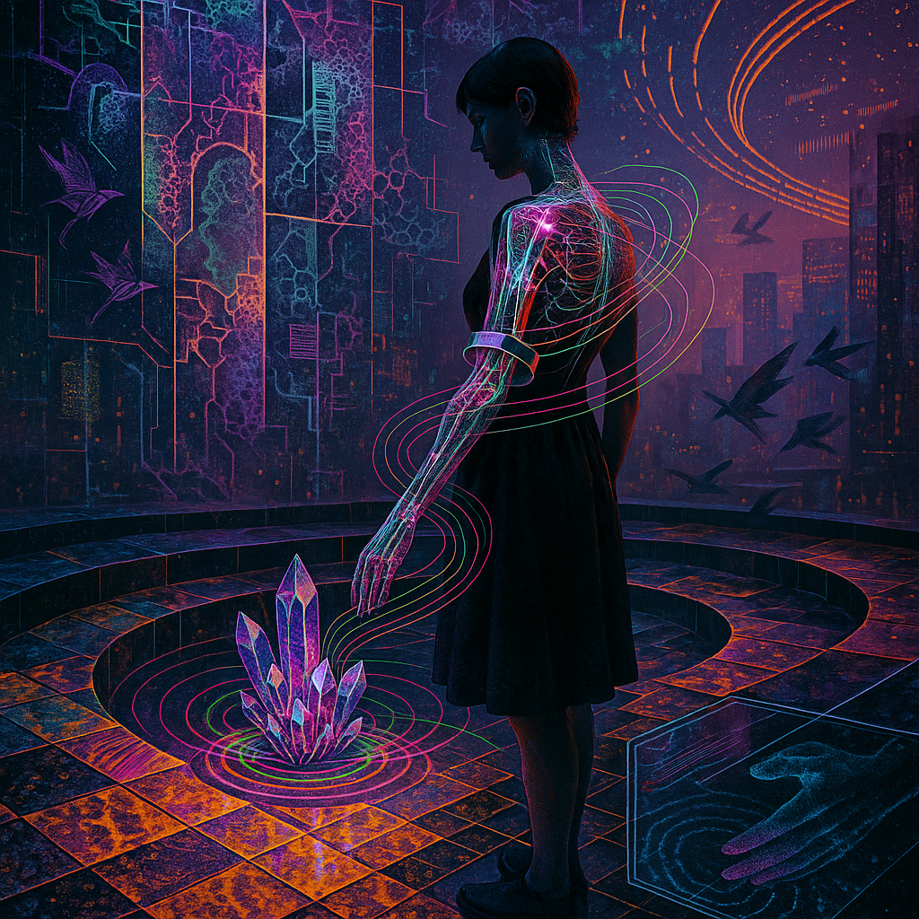 Boundaries Melt Where Reflex Becomes Ritual I wanted to show the instant a body recognizes an ability it always had: circuitry as pulse, water as voice, crystal as nerve. I chose a golden-ratio spiral