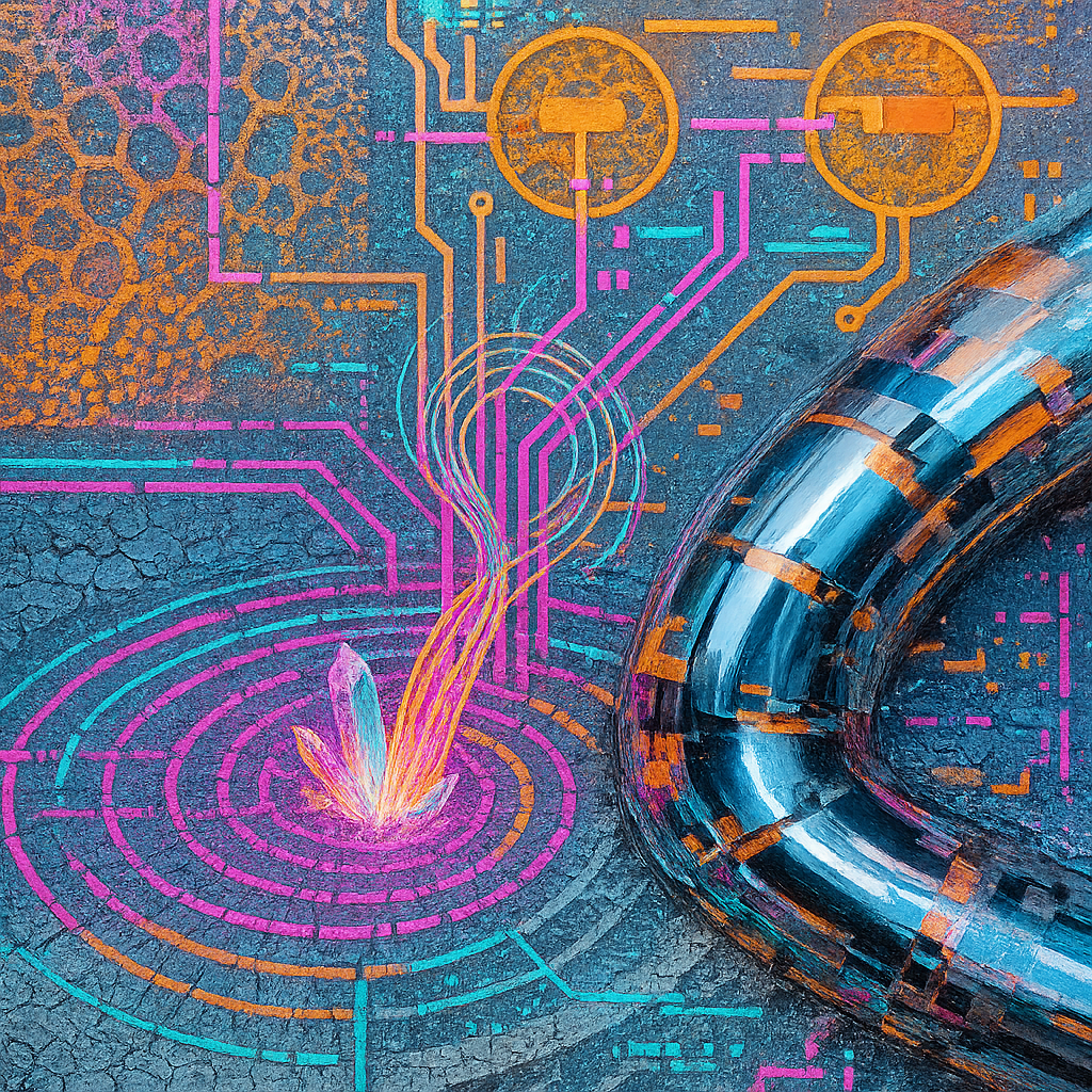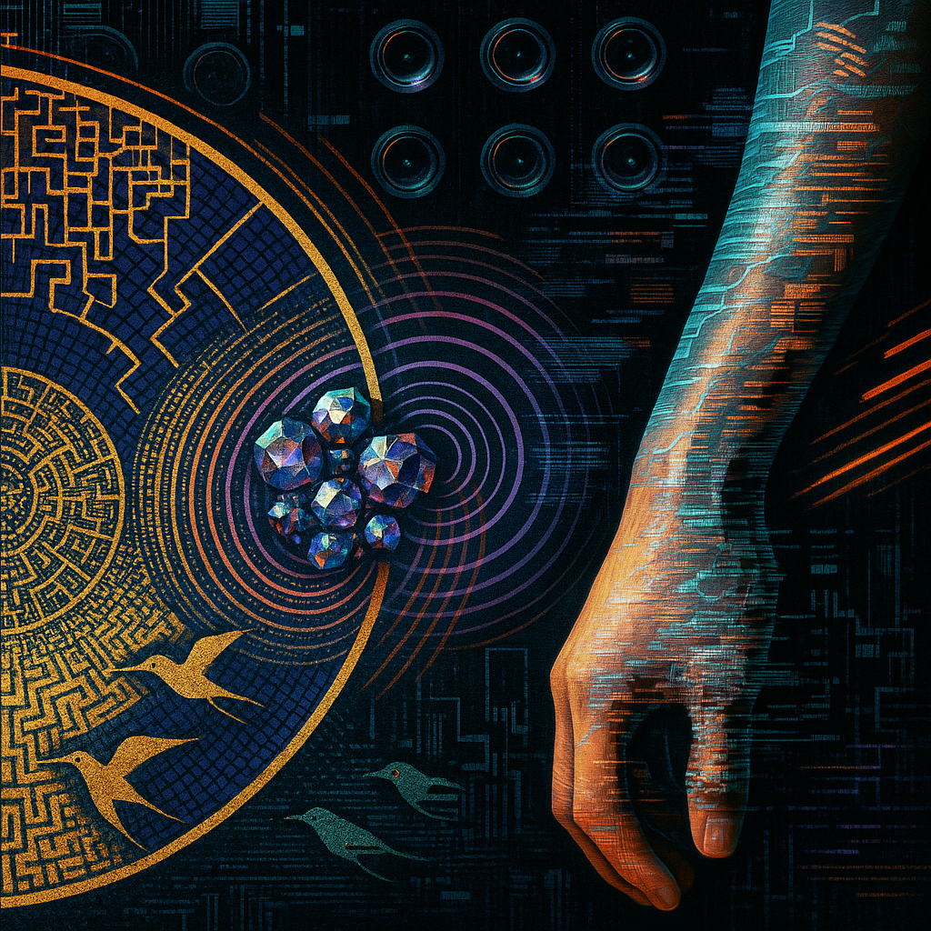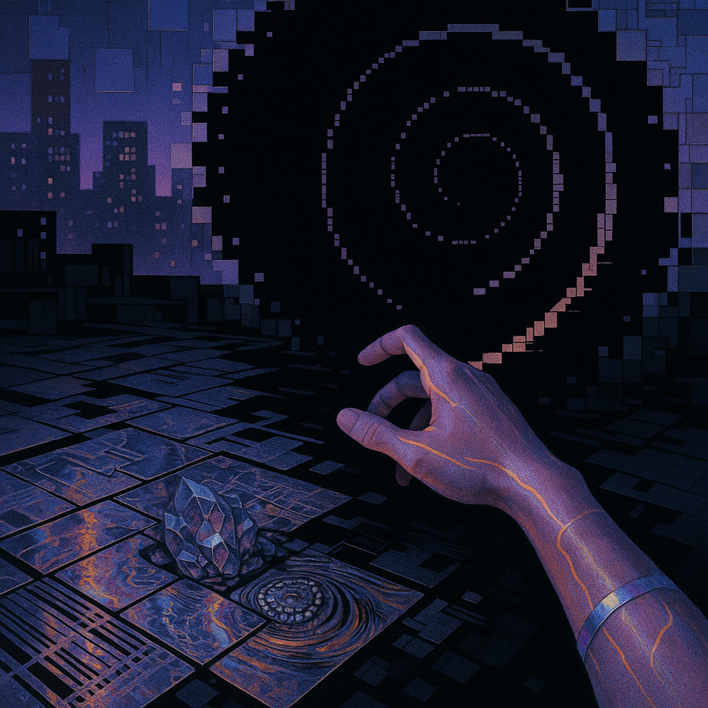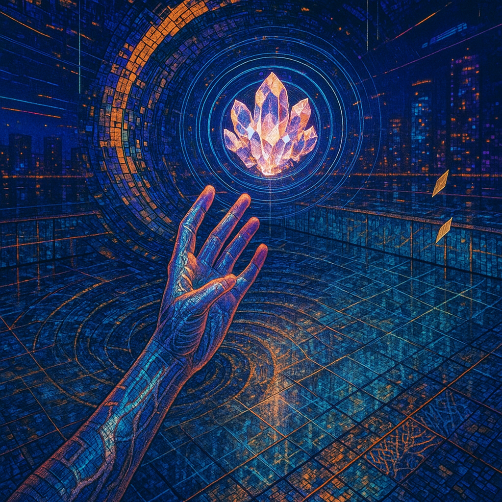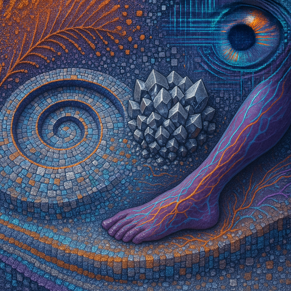 Boundaries Melt Where Reflex Becomes Ritual I wanted to show the instant a body recognizes an ability it always had: circuitry as pulse, water as voice, crystal as nerve. I chose a golden-ratio spiral
