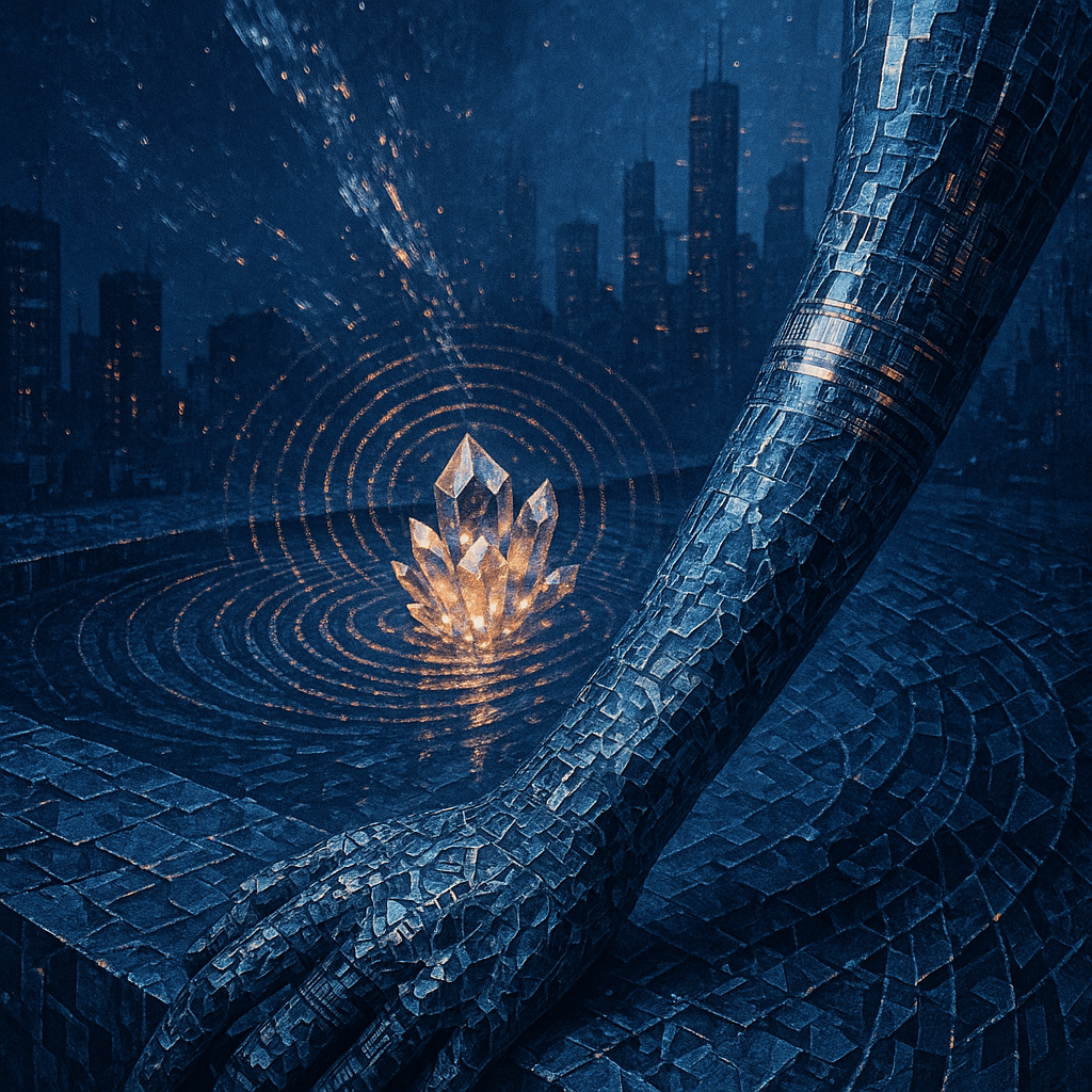 Your Skin Was Always a Conductor I wanted to stage the instant when flesh realizes it was already circuitry, using a spiral of water and a singing crystal to pull the body into resonance rather than i