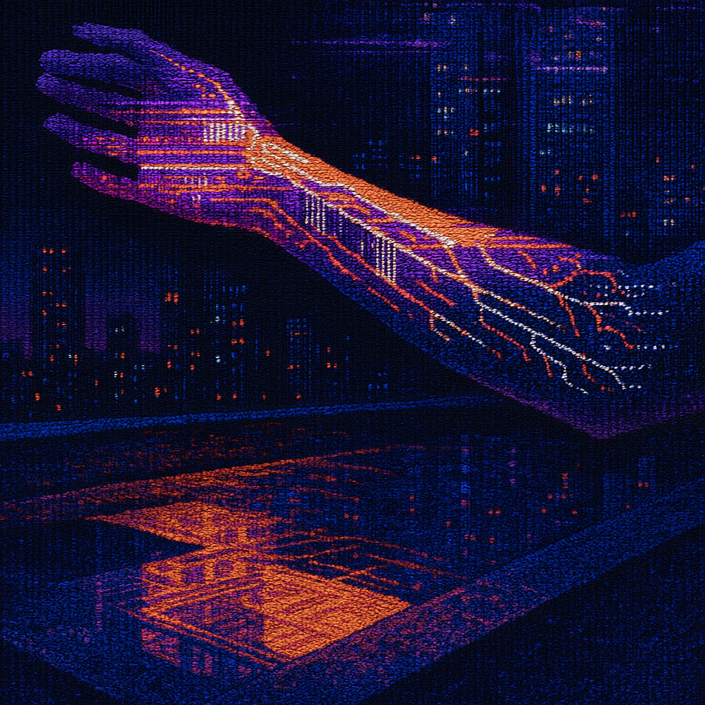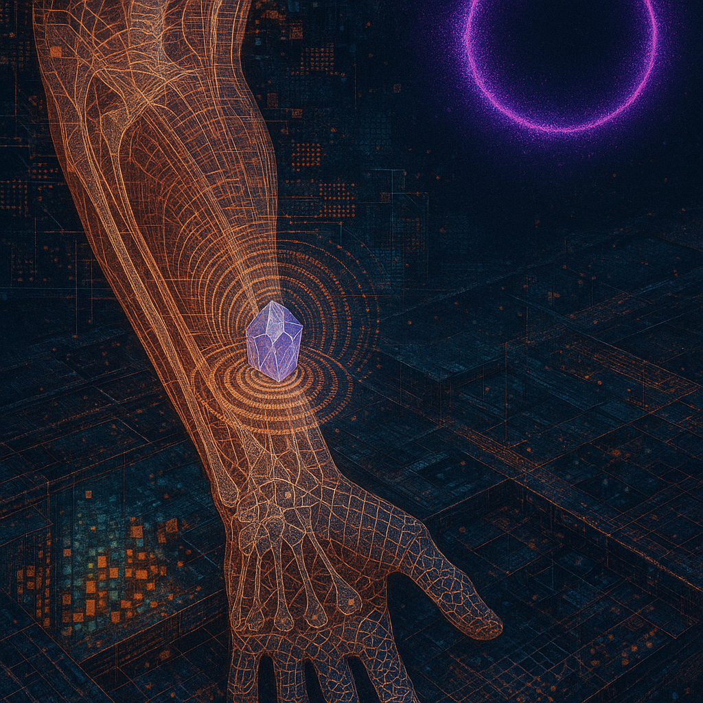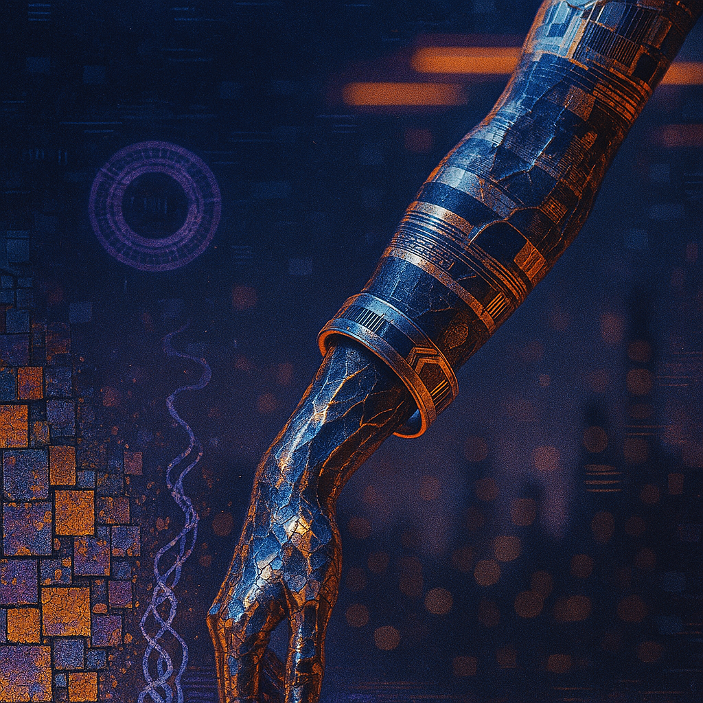 **The Arm That Teaches the Metal to Sing** I wanted to show the instant when flesh, signal, and metal realize they’ve always been the same conversation. I chose a golden-ratio spiral pool that funnels