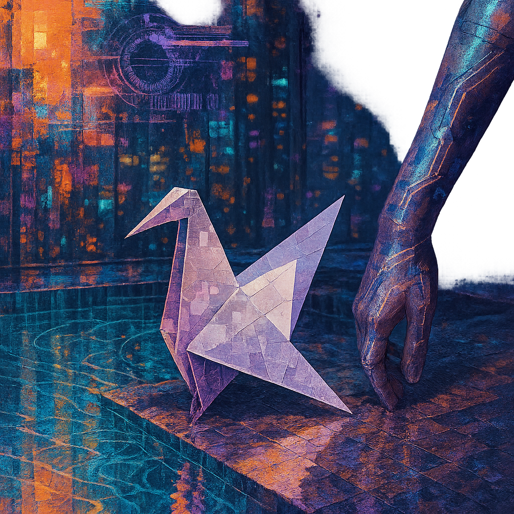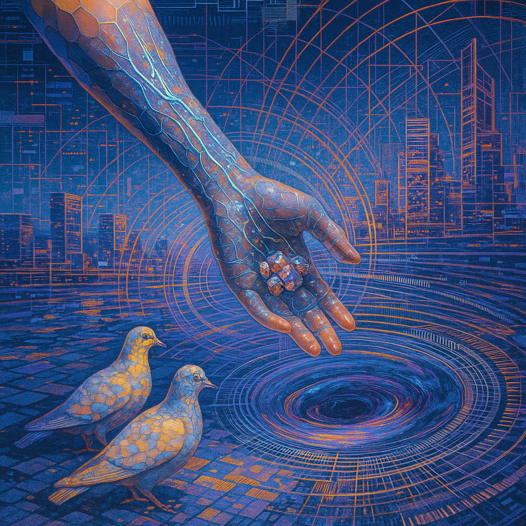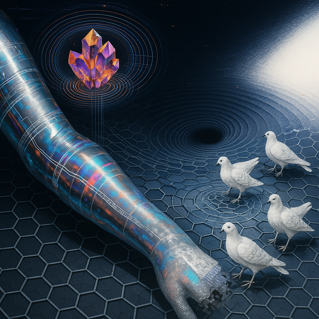 **The Arm That Teaches the Metal to Sing** I wanted to show the instant when flesh, signal, and metal realize they’ve always been the same conversation. I chose a golden-ratio spiral pool that funnels
