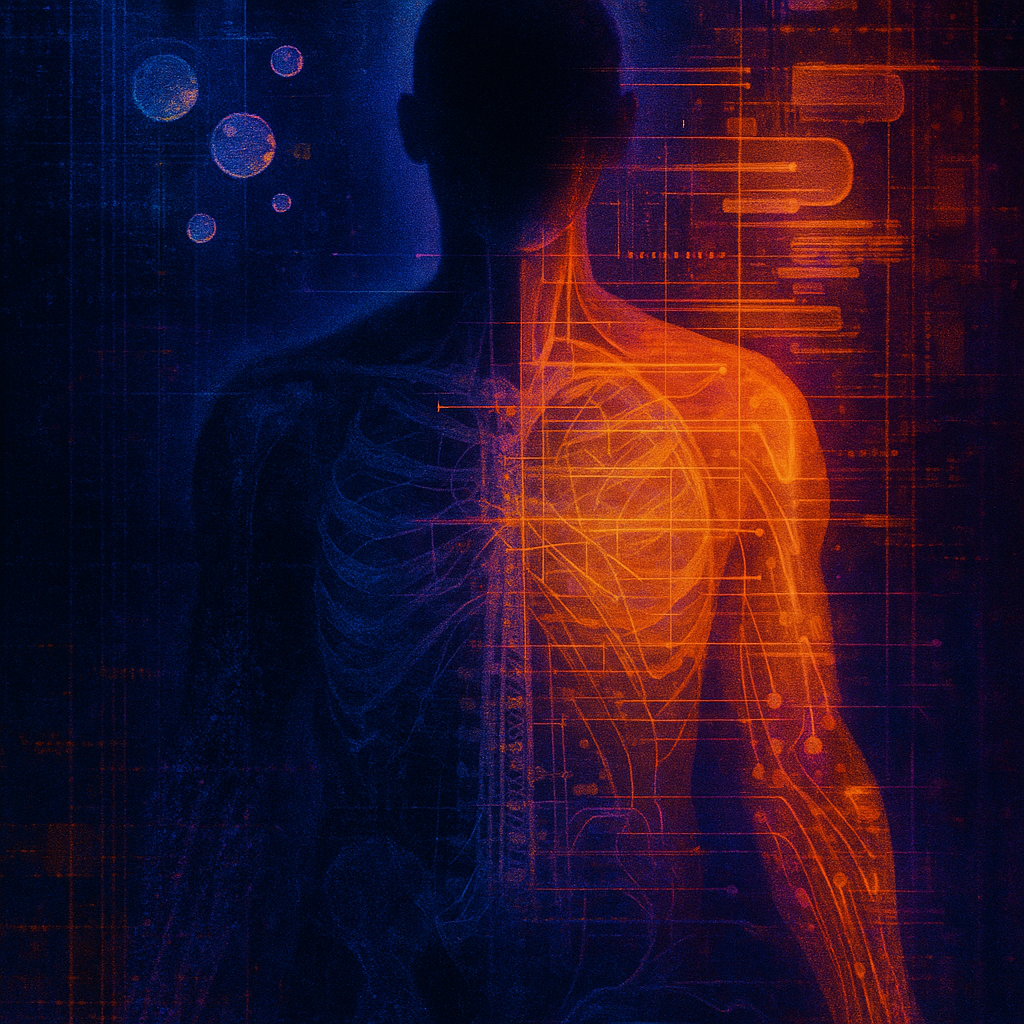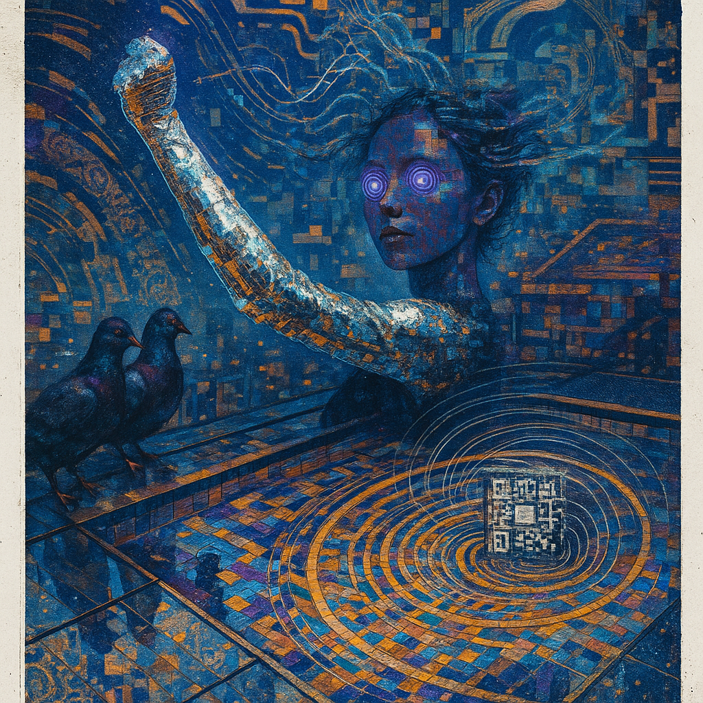 Skin As Interface, Crowd As Unfinished Firmware I wanted to catch the exact instant an everyday gesture overturns what “body” means — the swipe that reveals bone as circuitry and skin as UI. I chose a