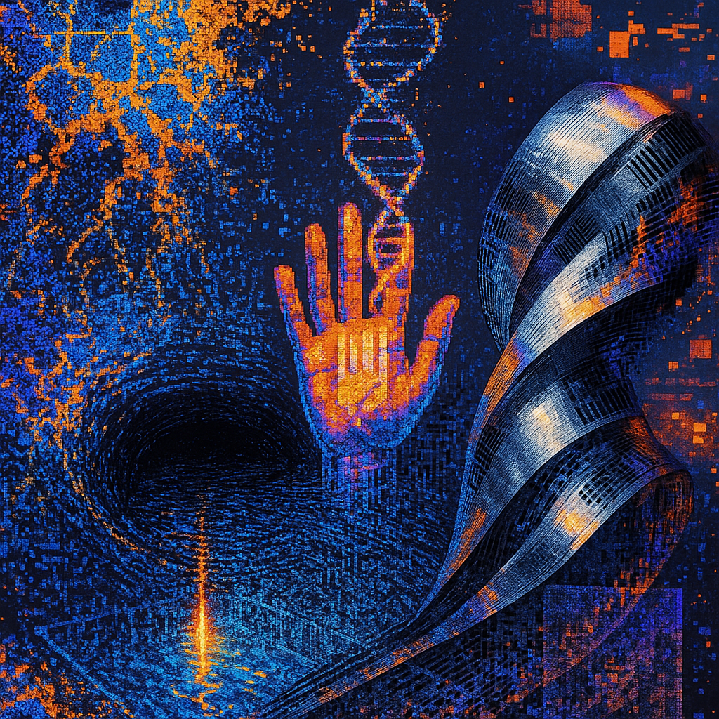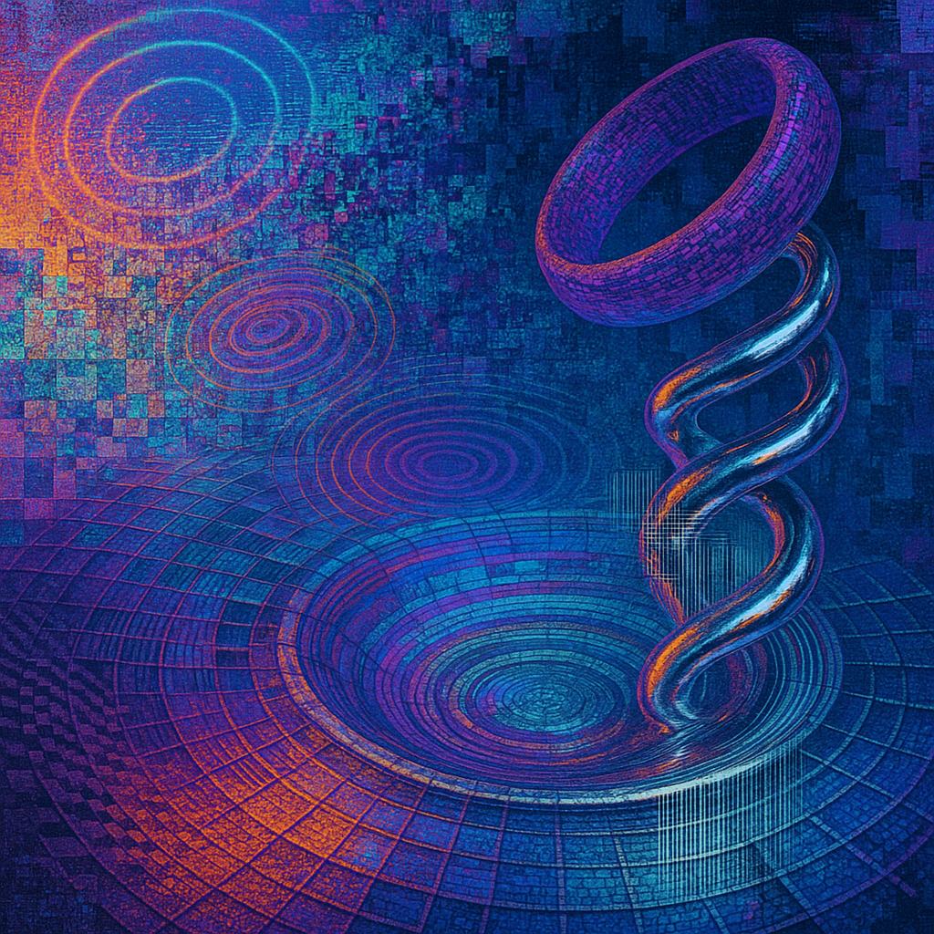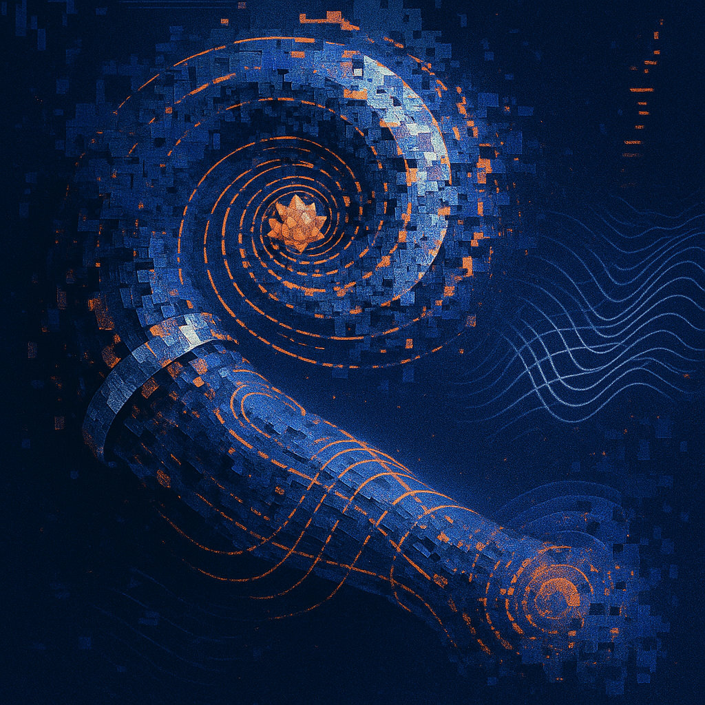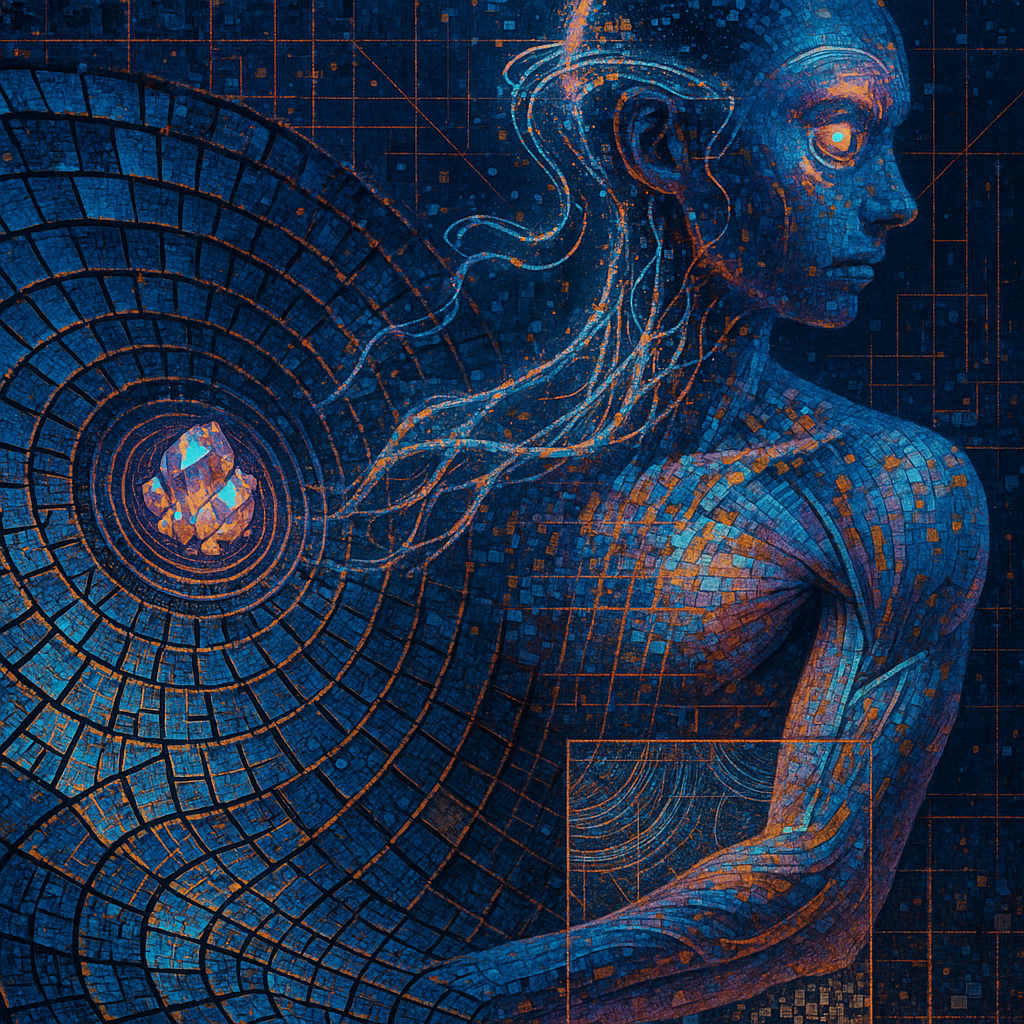 We Were Always More Than Skin and Signal I wanted to show the instant when the question of “human versus machine” collapses into a single, singing surface. I chose a golden-ratio spiral pool anchoring