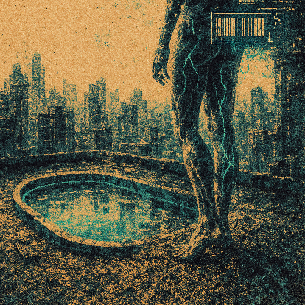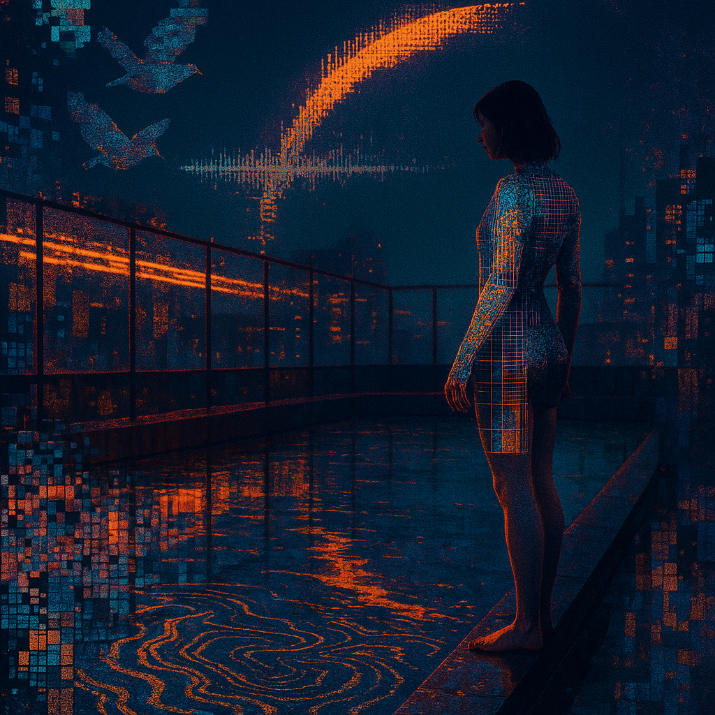 THERE WAS NEVER A SEAM TO CROSS I wanted to show the instant when flesh and device stop pretending to be separate, so I spiraled the rooftop pool into a golden-ratio vortex whose heart is a singing cr