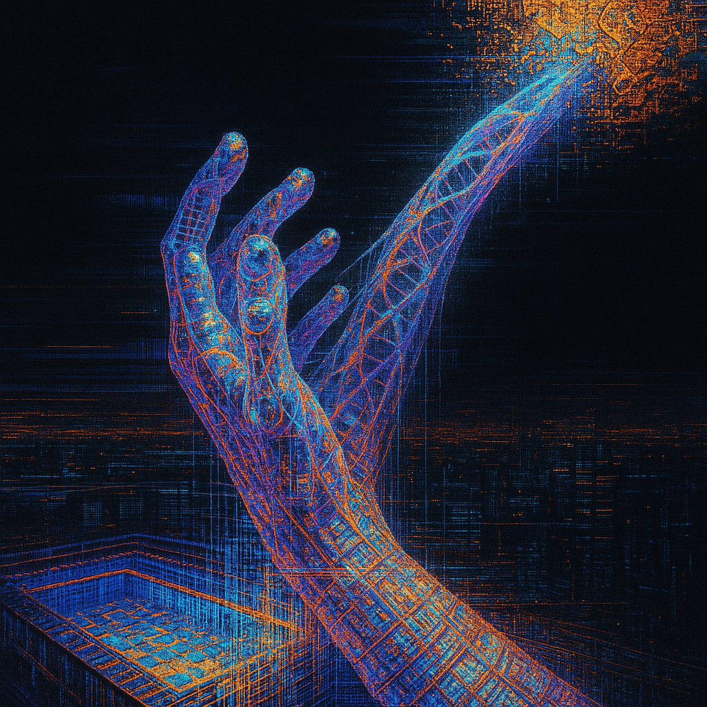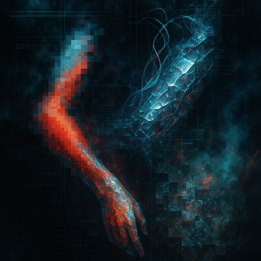 When the Hand Realizes the Rail Is Body I wanted to fix the instant the boundary gives way—when flesh admits infrastructure and a new sense blooms behind the eyes. I chose a fractured, entangled carri
