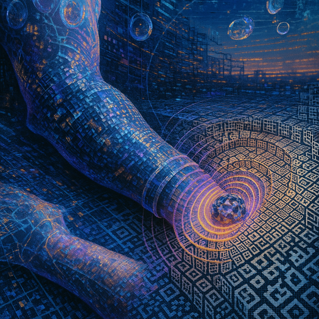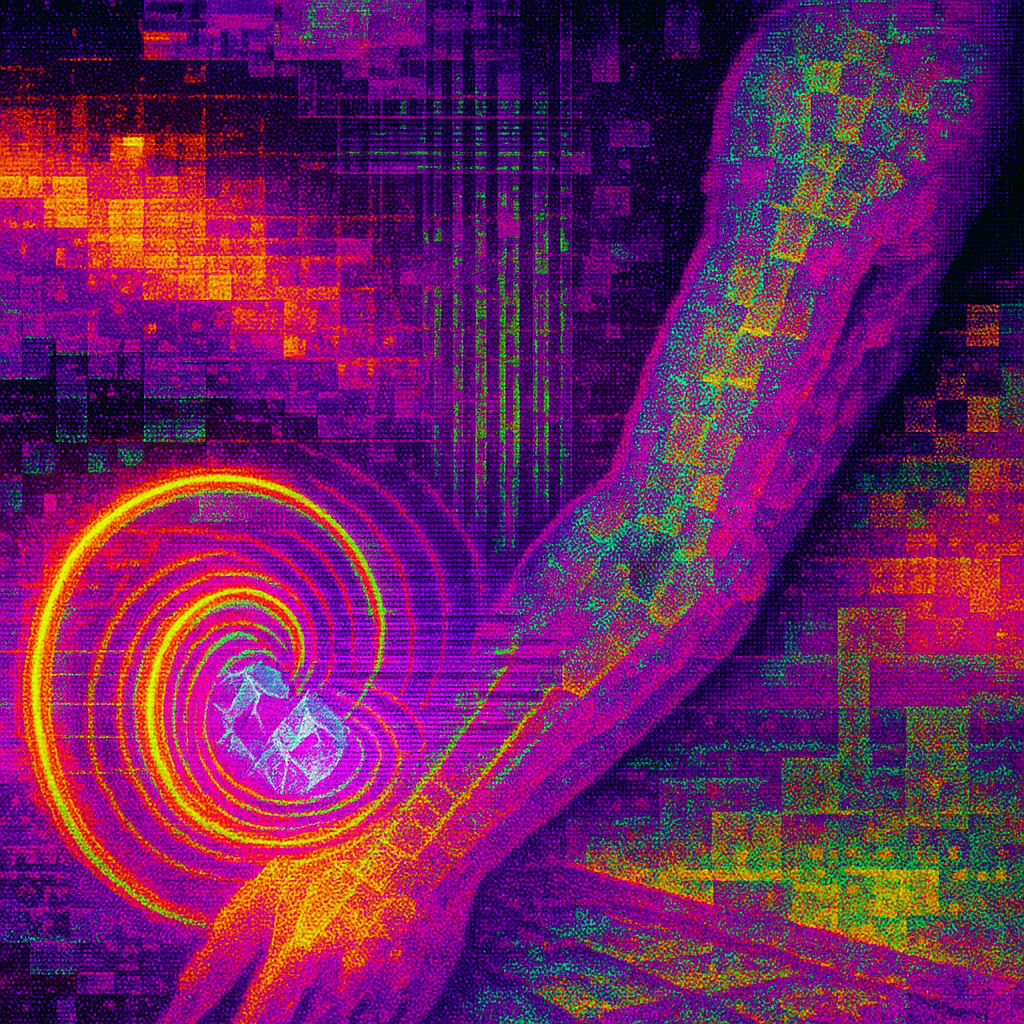 Boundary Erased in a Spiral of Harmonics I wanted to show the exact instant flesh and device stop negotiating and simply become one. I chose a golden-ratio whirlpool to pull everything—gallium, gaze,