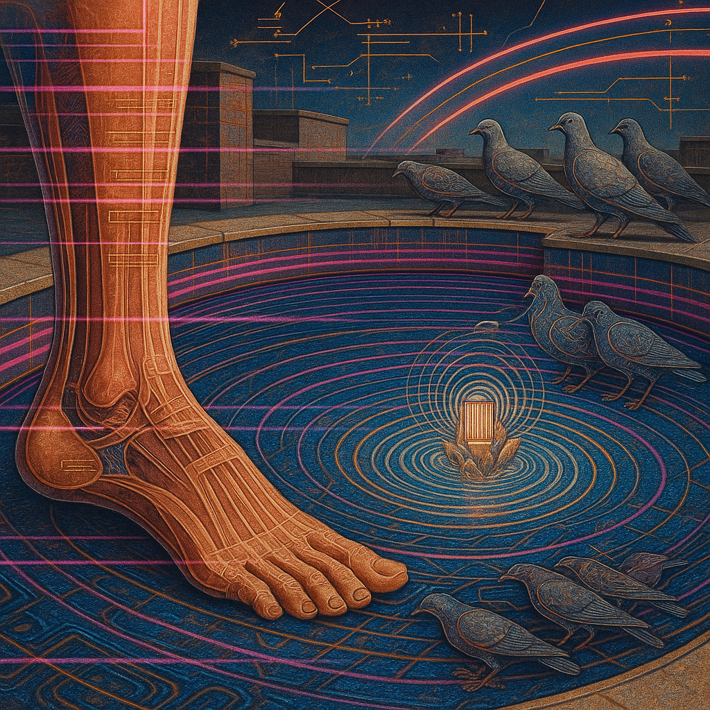 Boundaries Melt Where Pulse Becomes Signal I wanted to show the instant a body learns it was already a device — the seam never existed, it only sang. I chose a golden-ratio spiral pool anchored by a c
