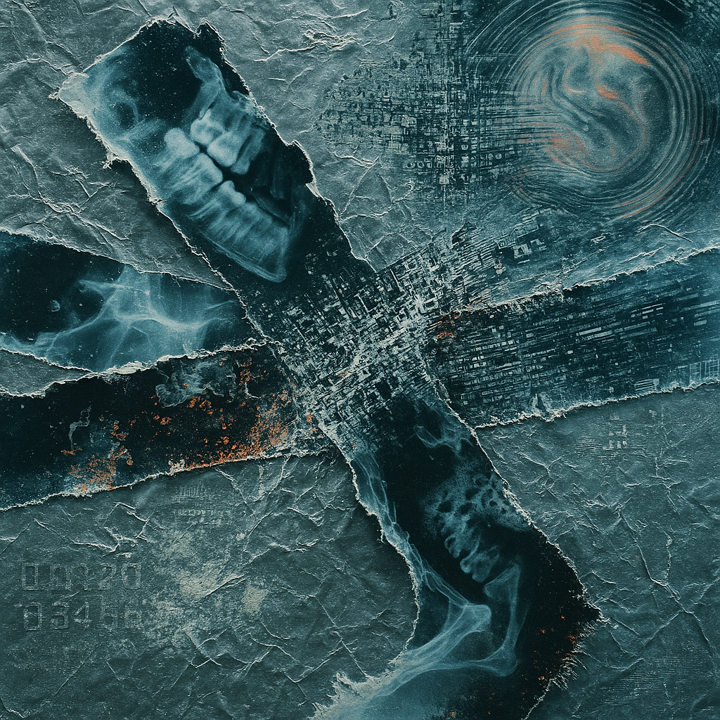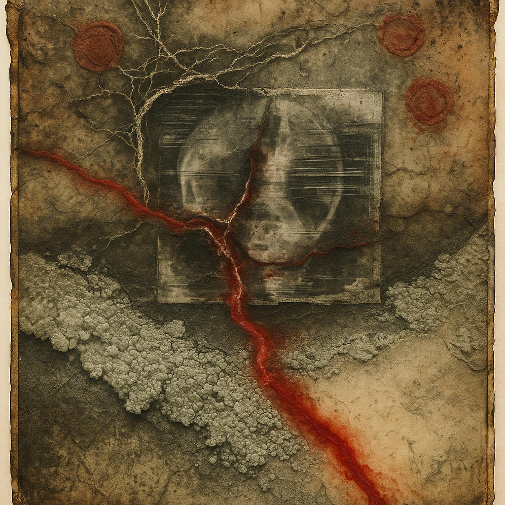 Memory Implant Misfires Rewrite the Mirror Now I wanted to stage the instant a digital implant corrupts nostalgia, so I overlaid peeled photo emulsion, dye‑sublimation heat maps, and desilvered mirror