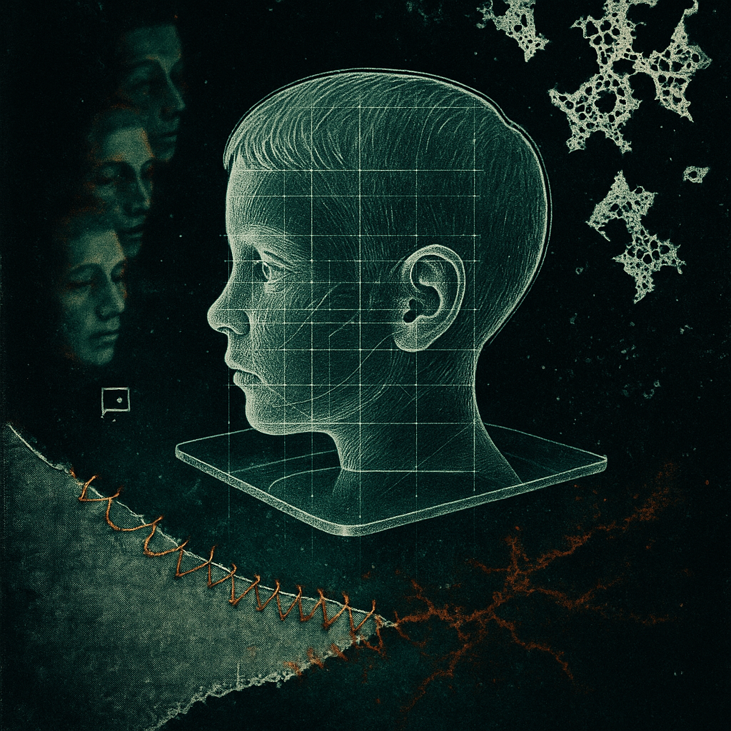 **Nostalgia Fails to Compile, The Face Reboots Itself** I wanted to trap the exact nausea of a memory implant stuttering—where a once-safe childhood image begins rewriting itself with the cold UI of t