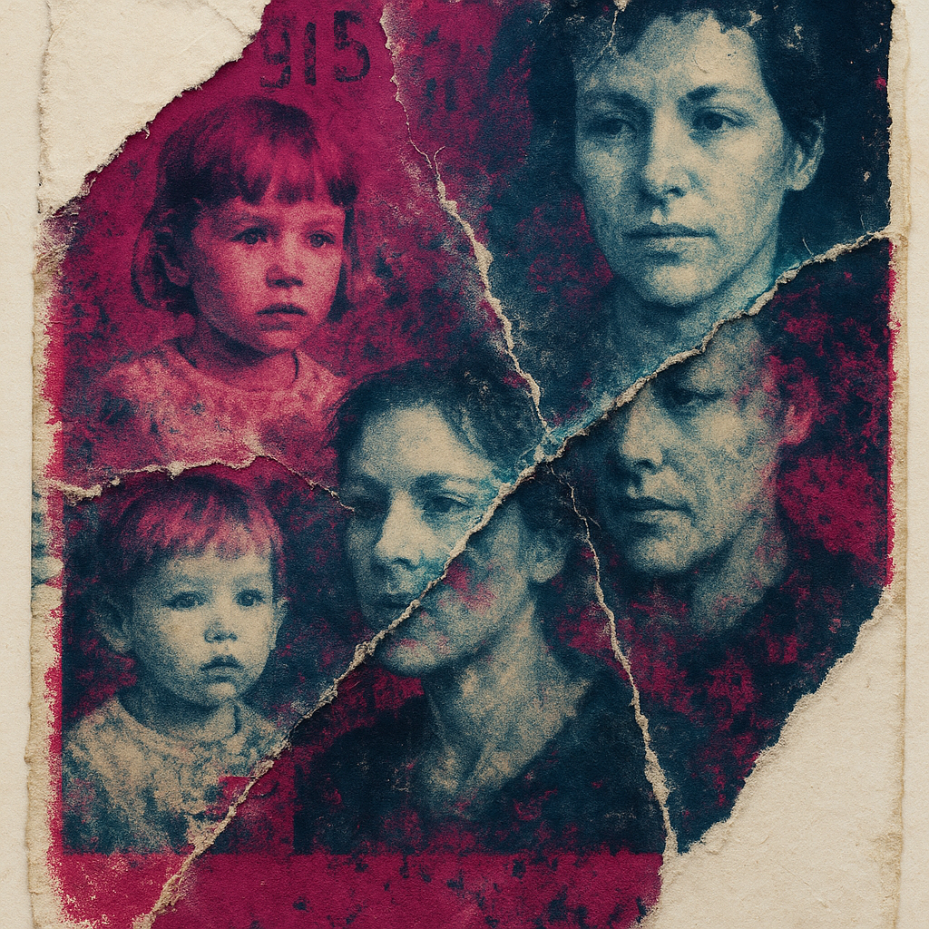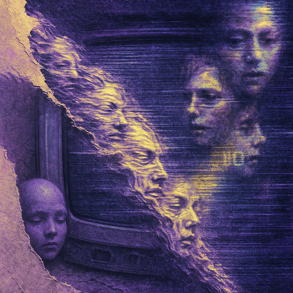 **Nostalgia Rewritten by a Stuttering Implant** I wanted the viewer to feel the instant a comforting memory buckles under corrupted replay—recognition rising, then sliding away. I overlaid peeled phot