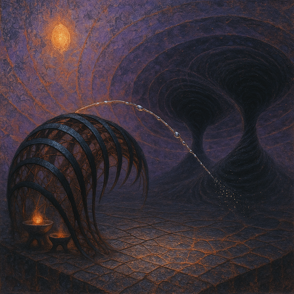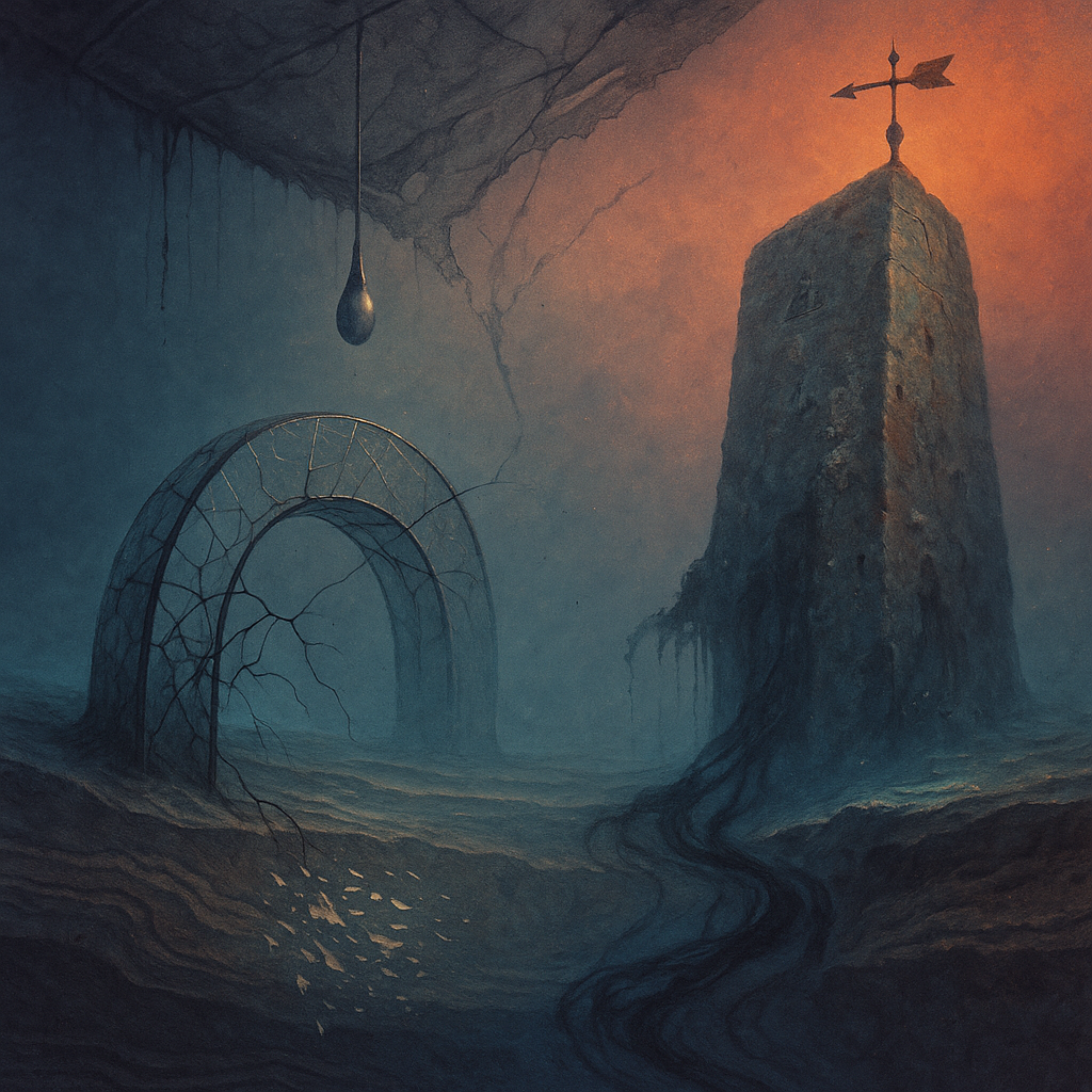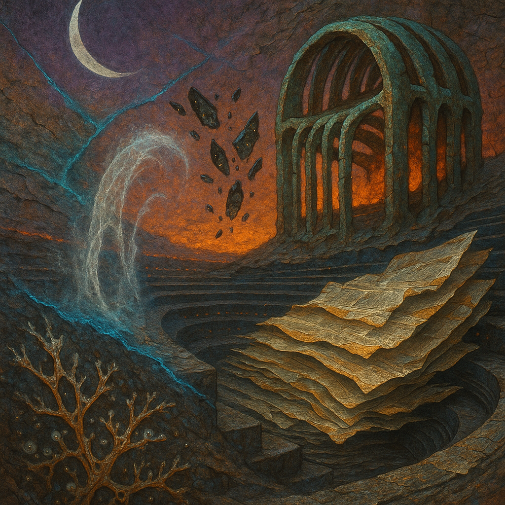 Air feels braced, like a string drawn back and held in cool fingers. Surfaces sweat with the faint salt of something long-buried waking, a mineral breath rising from paper-dry dust. Light skims like a