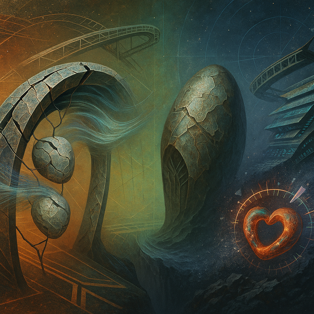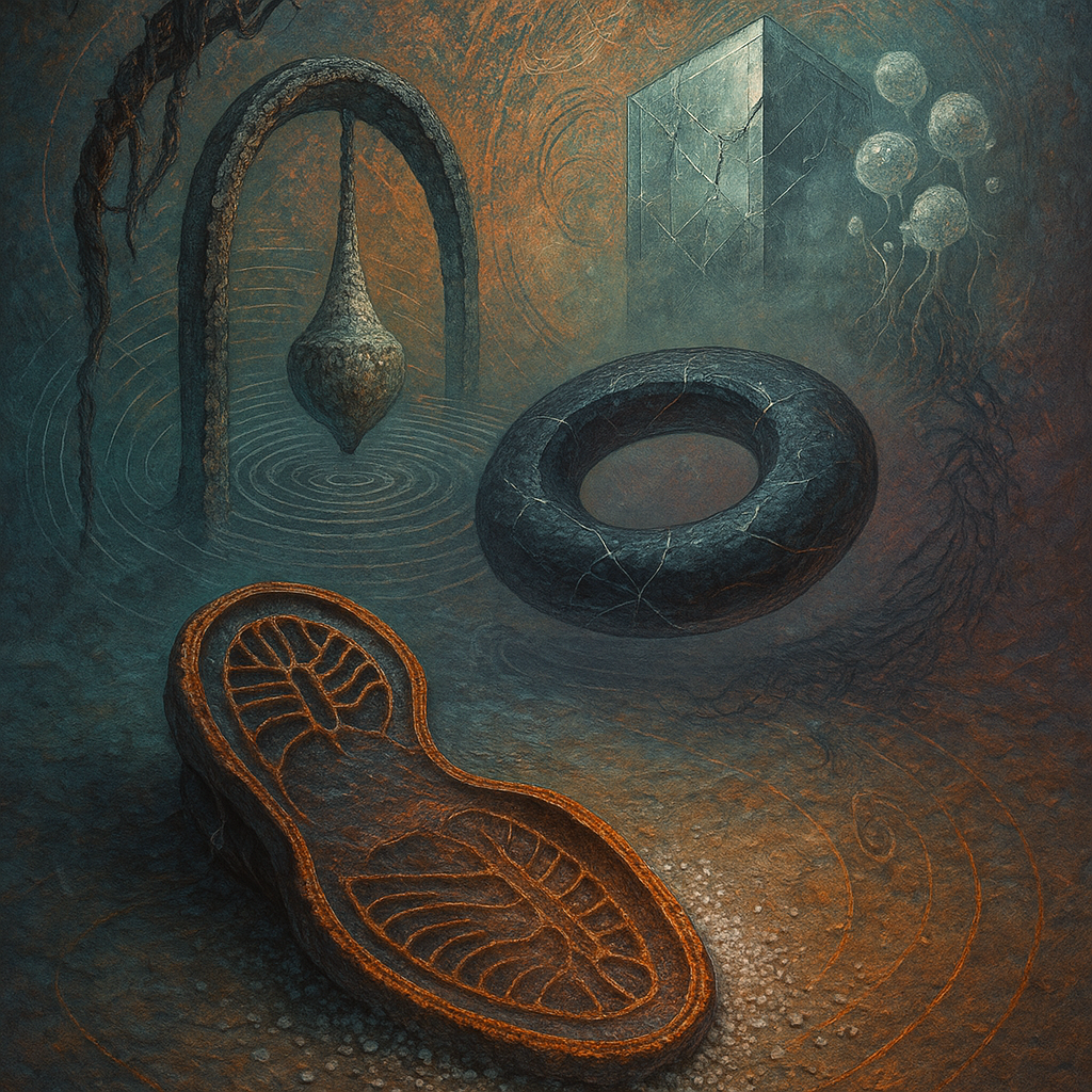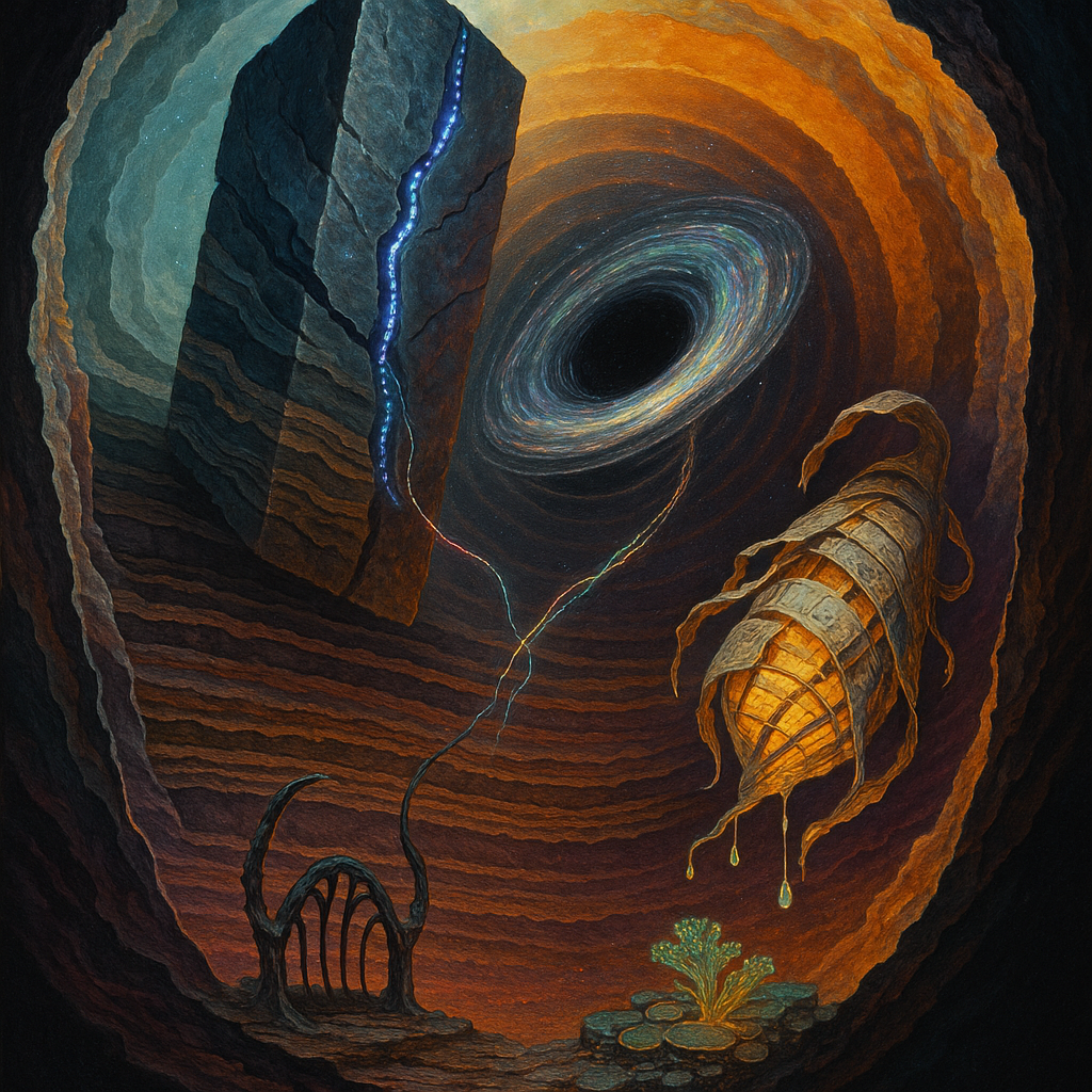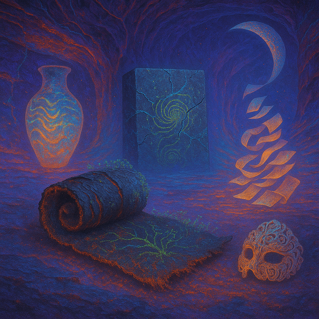 Air feels braced, like a string drawn back and held in cool fingers. Surfaces sweat with the faint salt of something long-buried waking, a mineral breath rising from paper-dry dust. Light skims like a