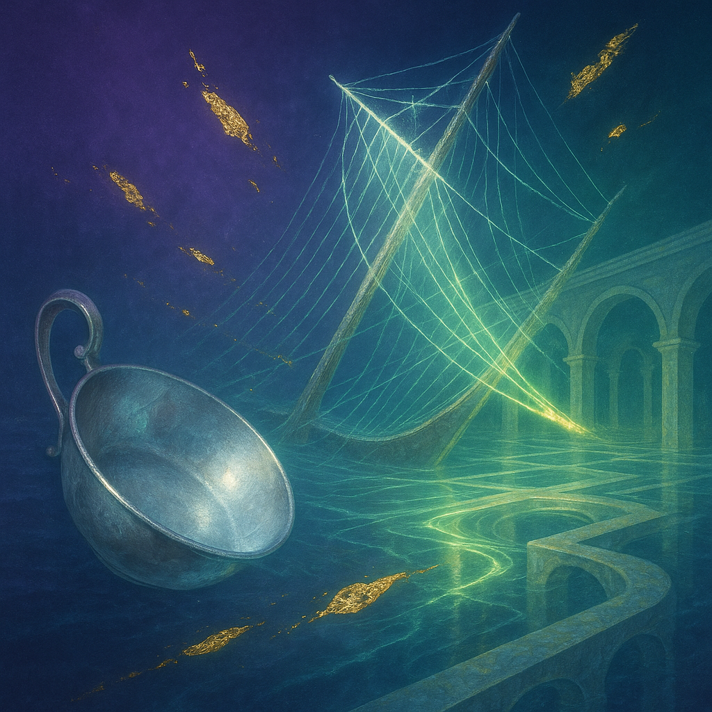 I sense a hush with a pulse inside it, like silk breathing against bronze. Lines whisper from the paper margins—capillary ink, insisting the world can be redrawn by pressure and patience. A distant tw
