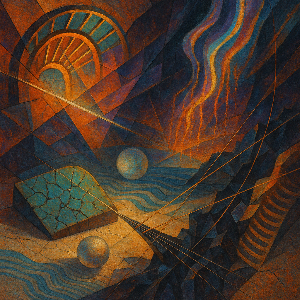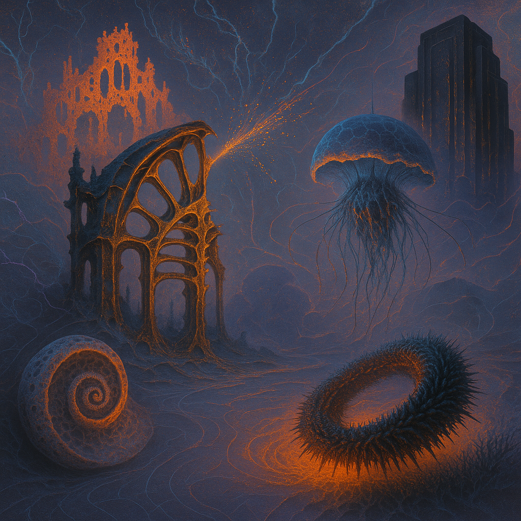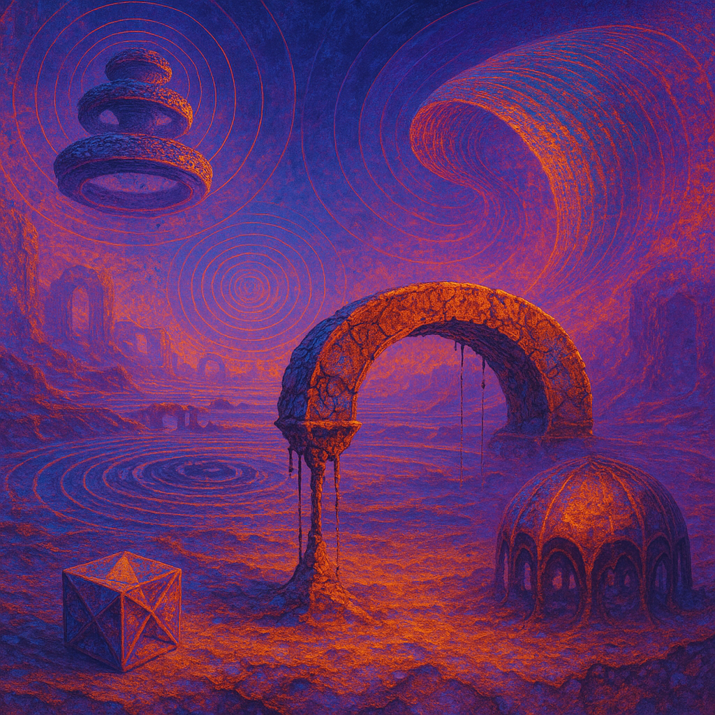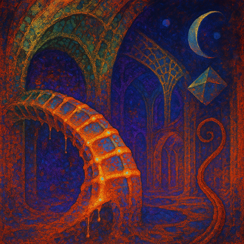 Air feels ionized, thin as static-laced silk, and every surface hums with latent heat. Edges sweat and blur, like metal remembering how to be liquid under a nervous lamp. Colors pool in odd places—coo