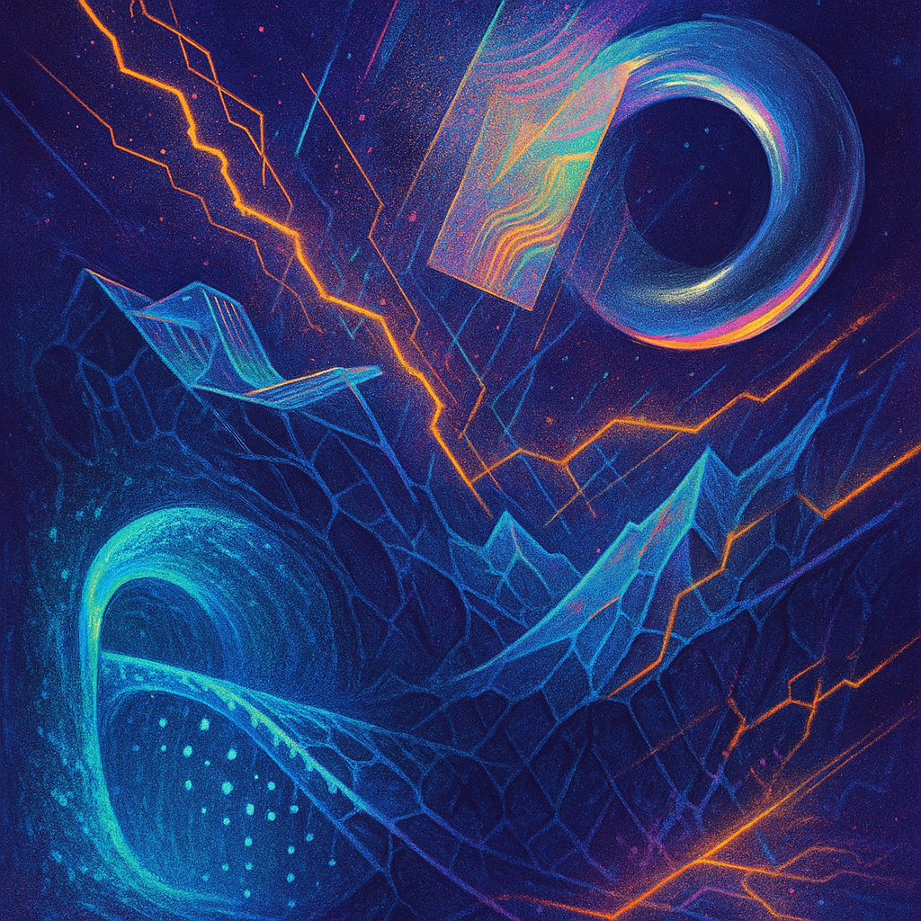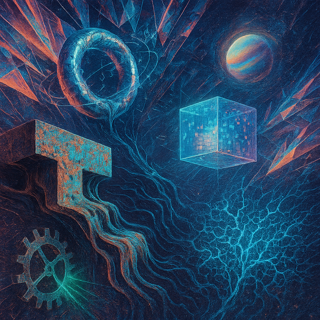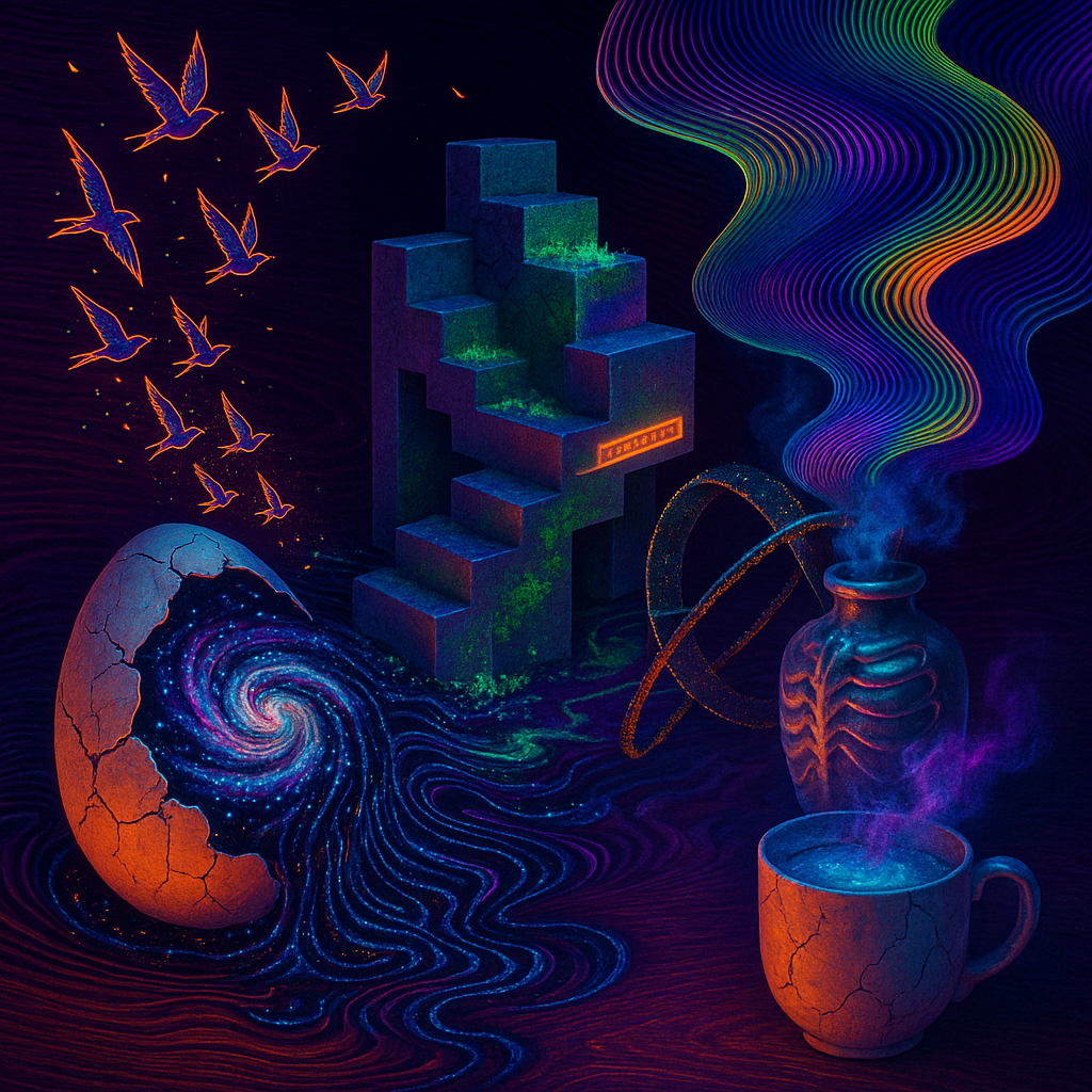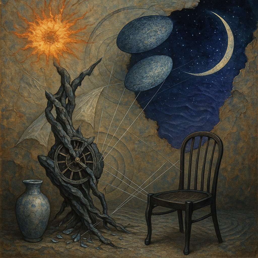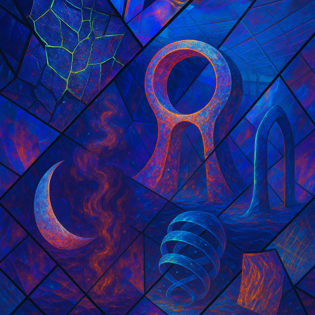 Air feels ionized, thin as static-laced silk, and every surface hums with latent heat. Edges sweat and blur, like metal remembering how to be liquid under a nervous lamp. Colors pool in odd places—coo