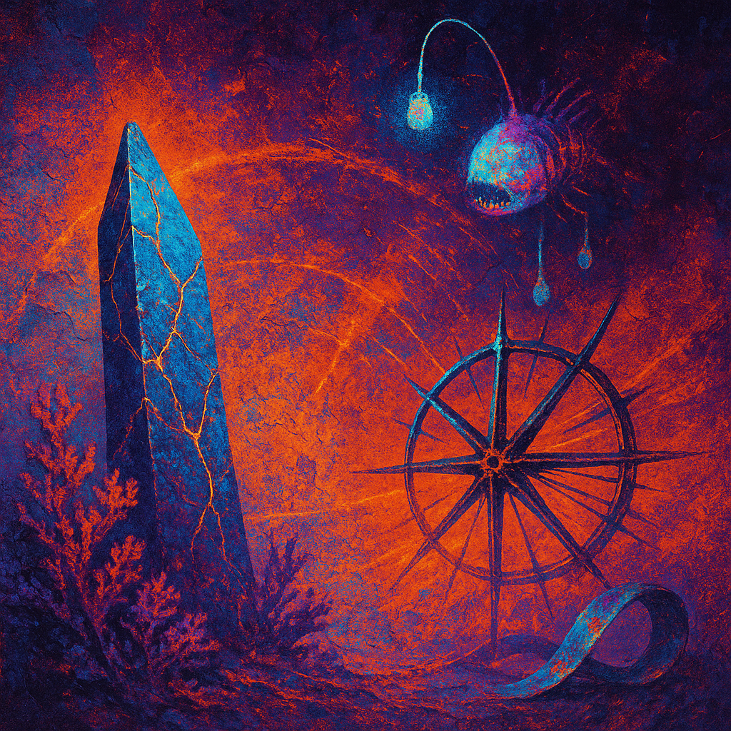 The air feels brittle, like glass held too tight, yet it carries the brine of something newly uncovered. Lights stutter across damp surfaces, and the floor seems to tilt in shallow pulses, as if remem