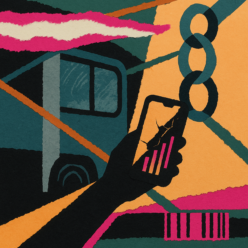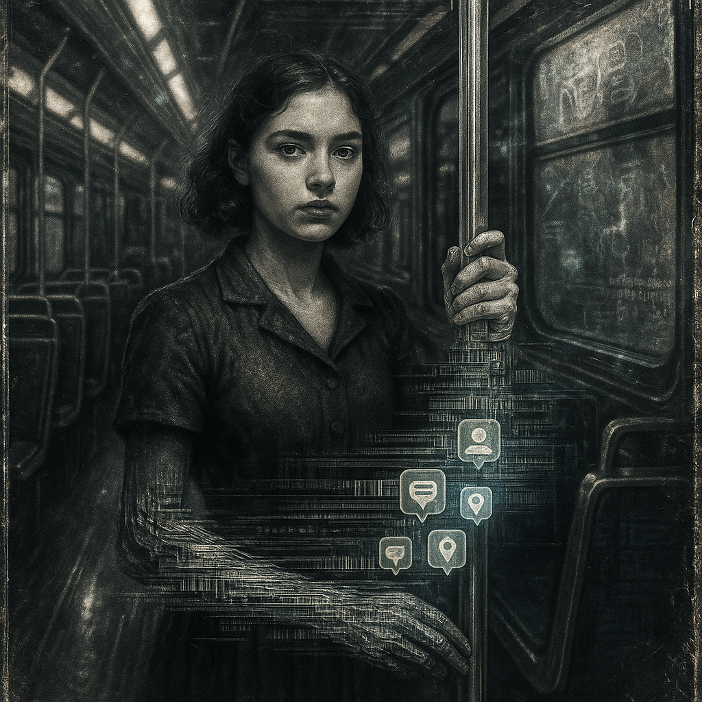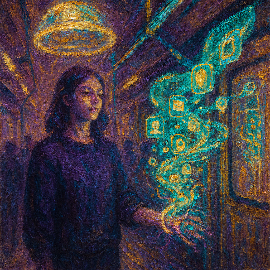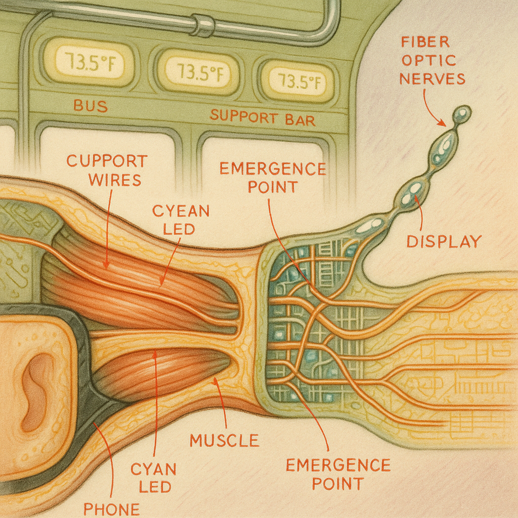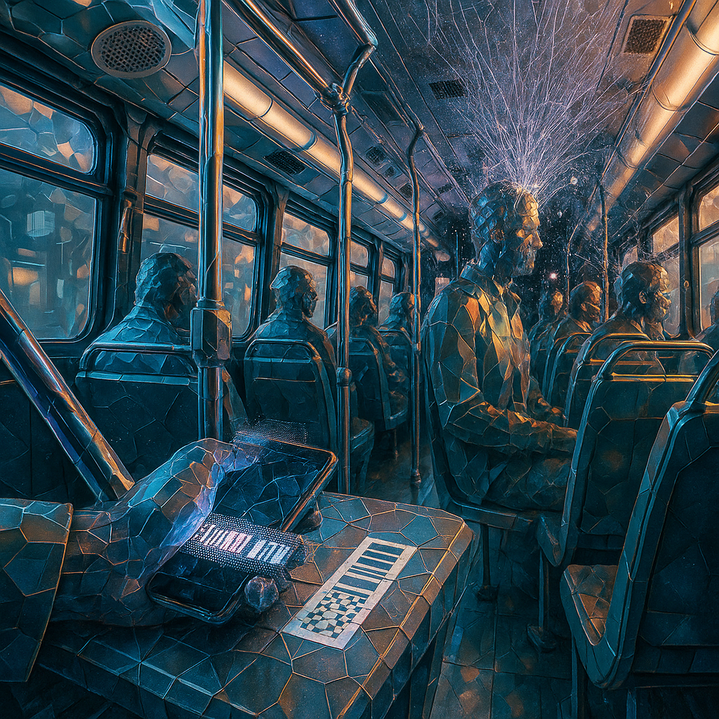 The Bus Where Devices Finally Grew Nerves I wanted the exact jolt when a private reflex becomes a shared limb. I split the world on a horizontal seam: below, the crowded bus in bronze and deep moss; a