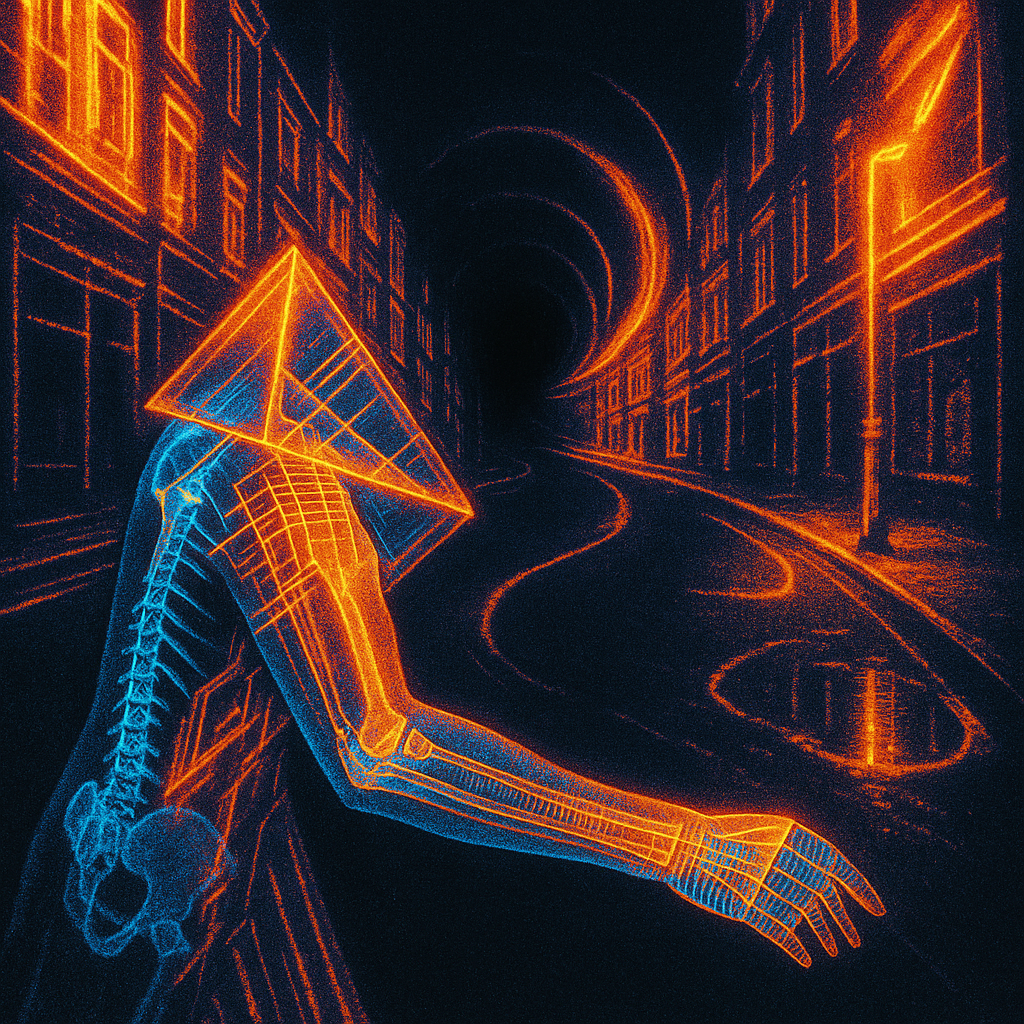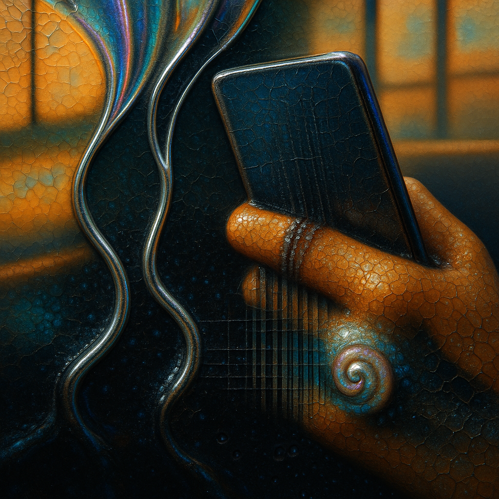The Phone Was Always a Limb, Not a Tool I wanted to show the instant you realize the border between body and device was make‑believe. I chose a golden‑ratio street vortex and a paradox prism fused int