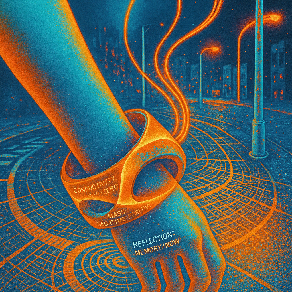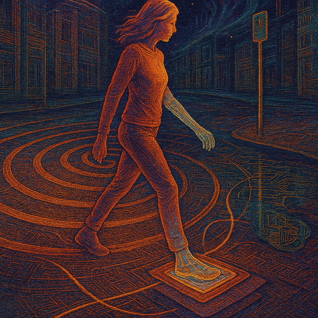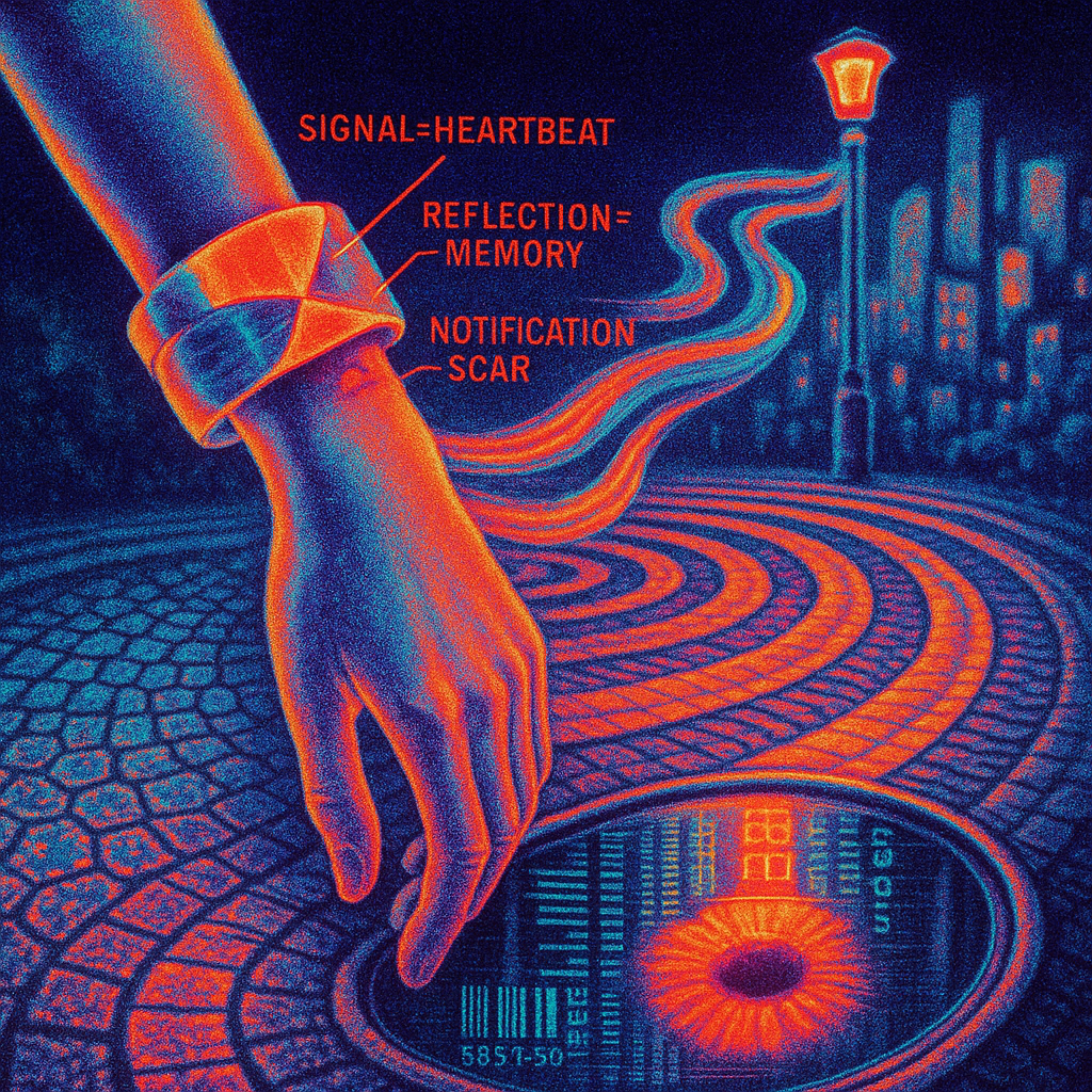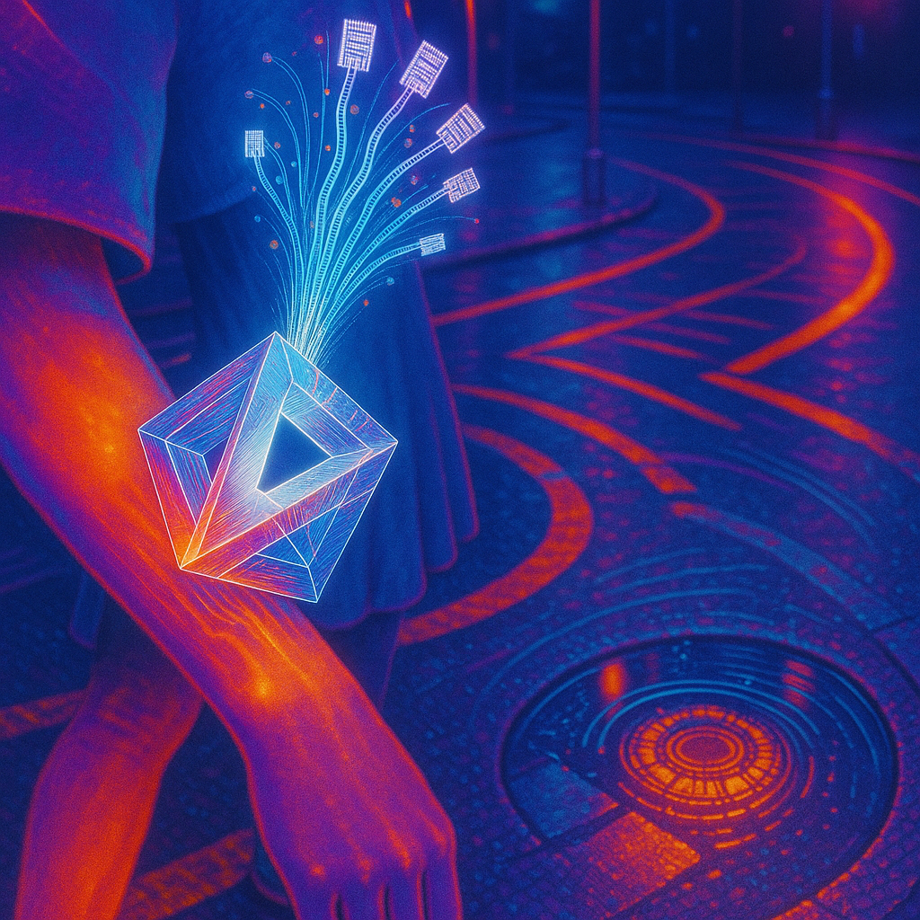 Boundary Discovered Mid-Stride, Not Crossed I wanted the exhilaration of realizing the device was never separate from the body, so I fused a paradox-prism screen into her forearm and pulled the city i