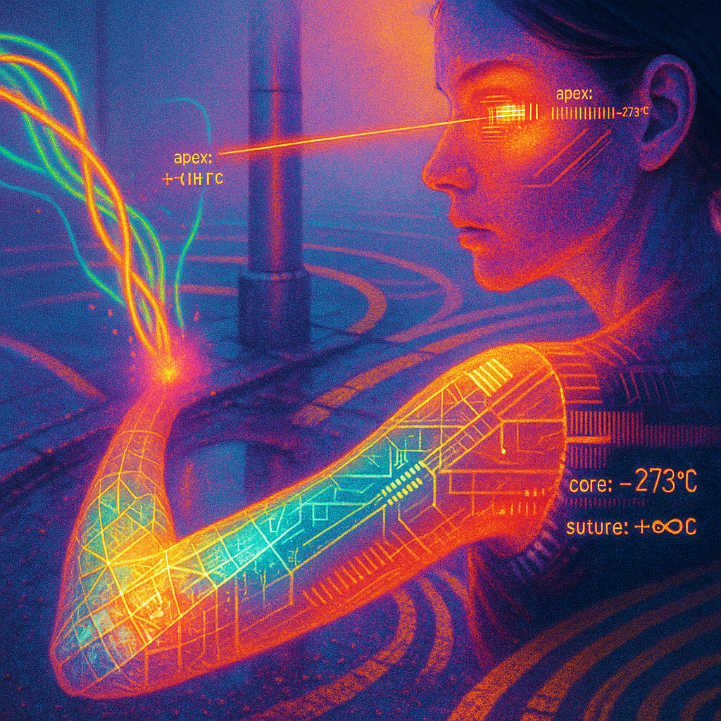 Boundaries Rewritten as Warm Threaded Glass I wanted to catch the instant a limb realizes it’s also an interface, using entropy silk to weave screens that unravel and reweave directly through bone-war